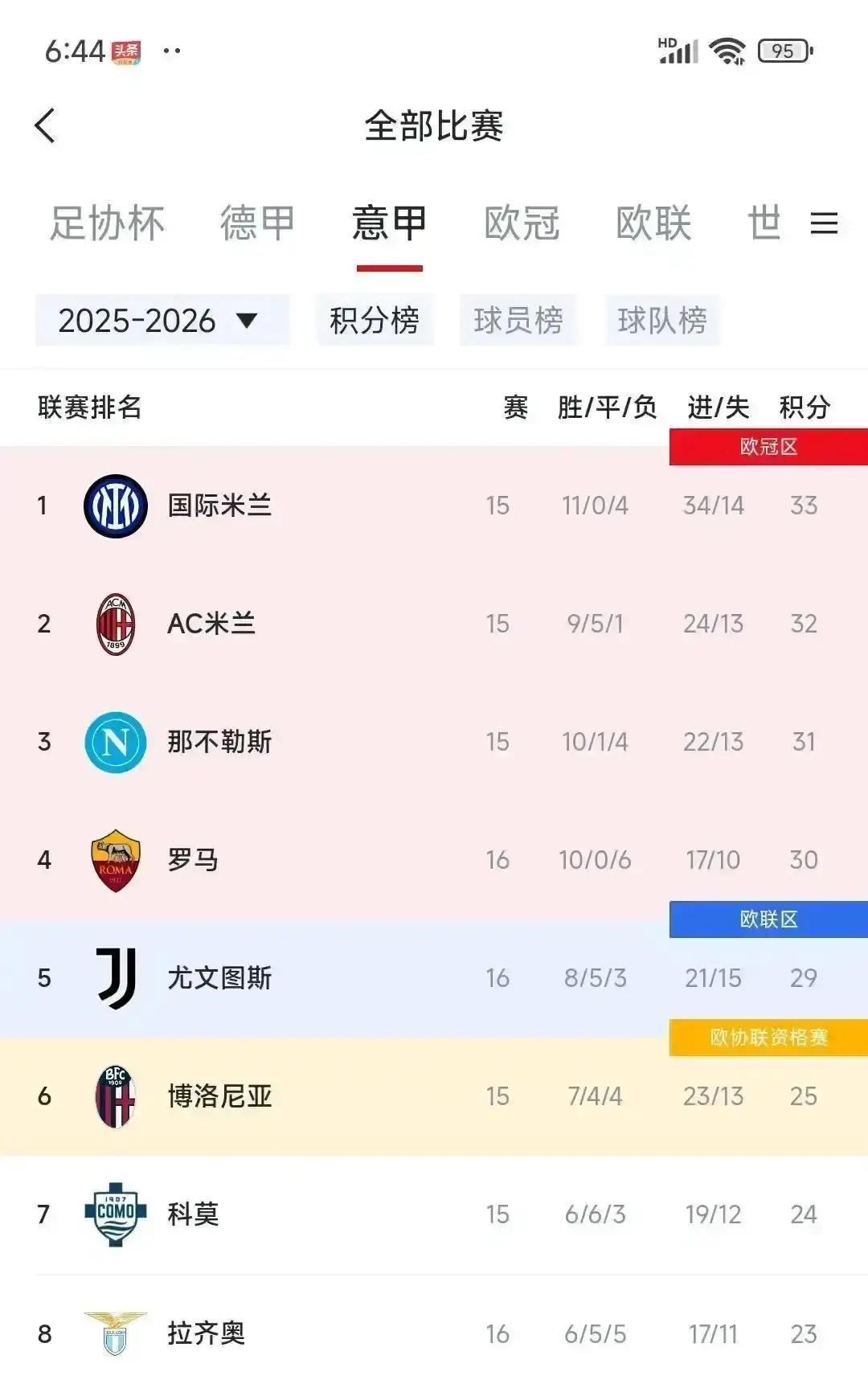 别急着把冠军奖杯刻上国际米兰的名字。 积分榜上这5分差距,经不起一场德比的颠簸。4月22日,梅阿查球场,米兰德比。过去10次交手,国际米兰赢了6次。但这一次,AC米兰带着整个赛季的憋屈而来。 看看赛程硬度。国米最后五个对手,平均排名第9。米兰的对手,平均排名第7。尤文图斯更凶险,最后5场有4场要打欧战区球队。图拉姆肌肉拉伤,洛卡特利停赛,托莫里火线复出——每一个细节都在天平上加了砝码。 意甲榜首今年已经换了7次主人。最后一轮,尤文图斯直接对阵AC米兰。如果分差保持在3分之内,那90分钟就是整个赛季的压缩。 所以,忘记76分的数字。真正的冠军,现在才开始书写答案。这不是终点线前的冲刺,而是一场心跳到最后的马拉松。