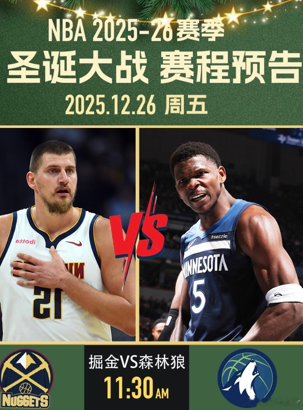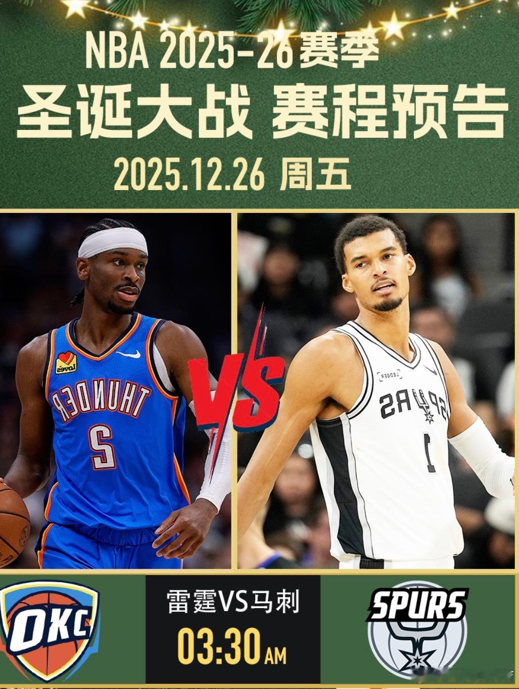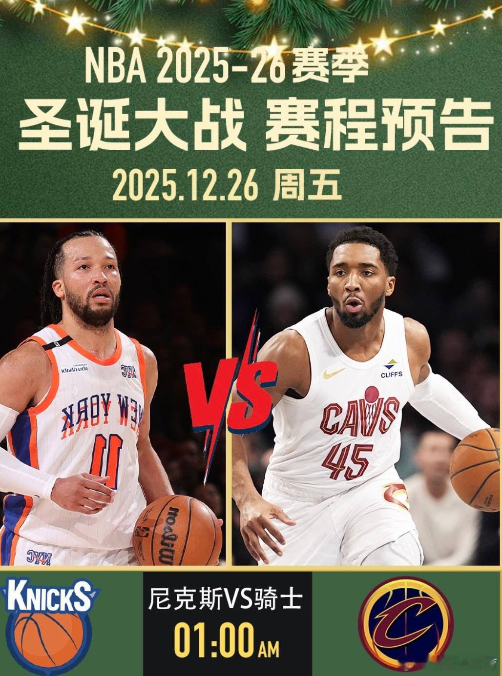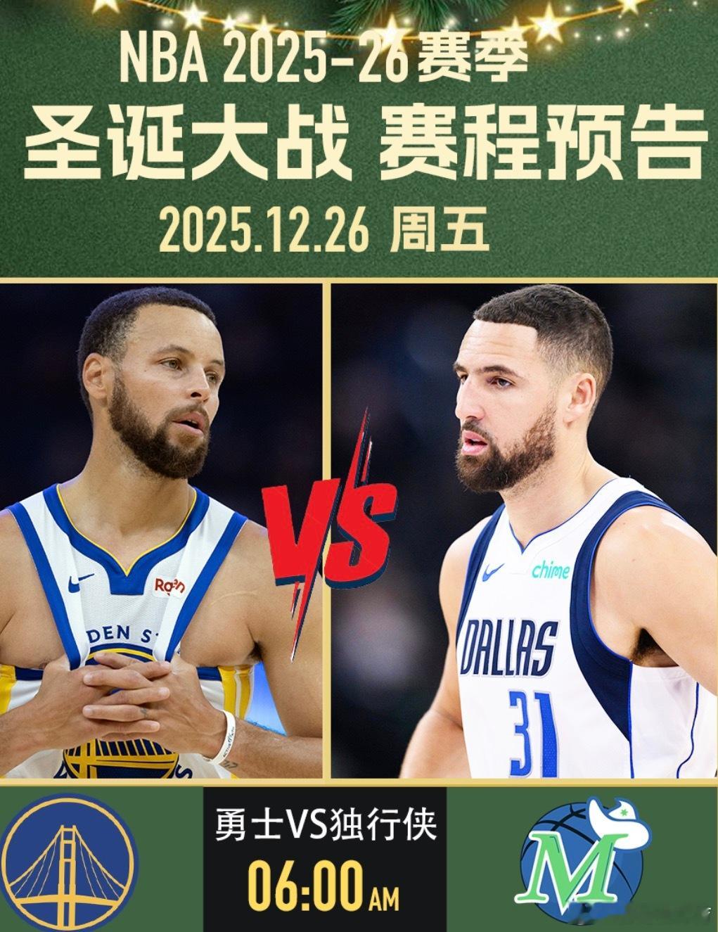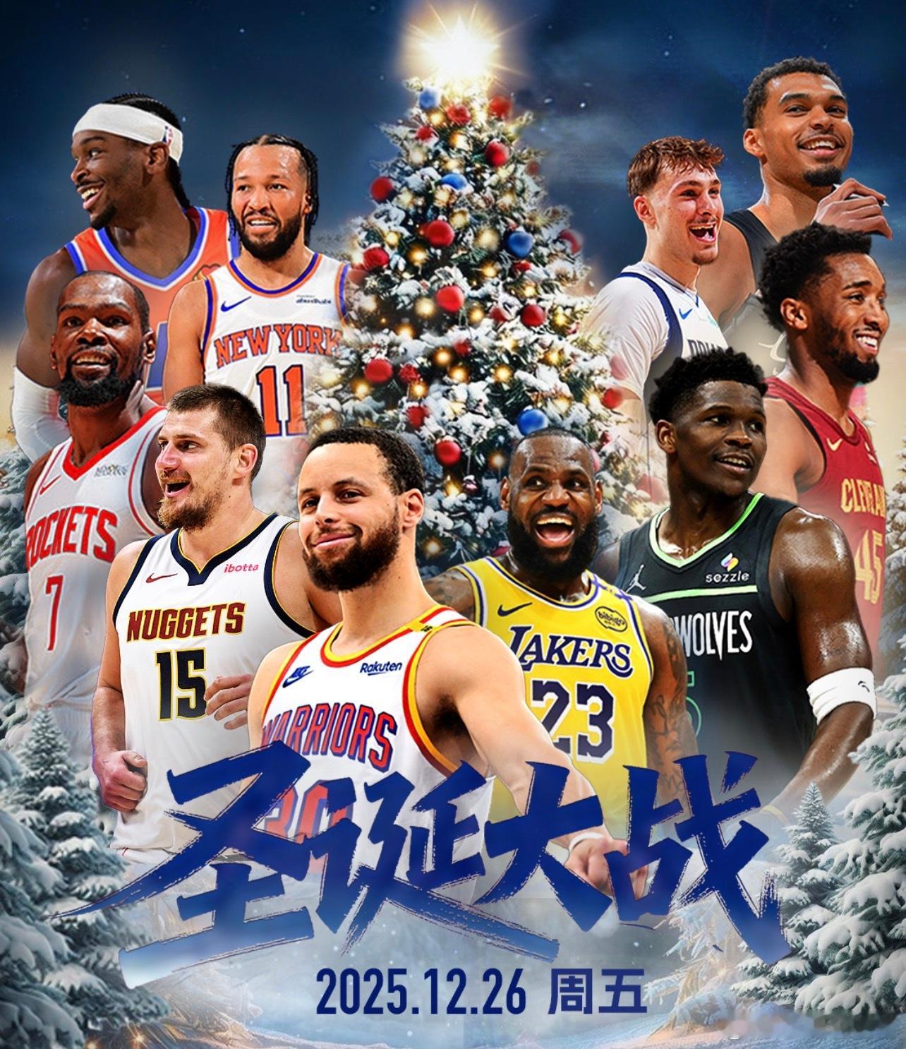 NBA将于今日迎来一年一度的圣诞大战。在安排的5场对决中,有4场是对阵双方首次在圣诞大战中相遇。揭幕战由米切尔重返家乡纽约对阵布伦森打响;随后马刺与雷霆迎来本月第三次交锋;克莱将以客队身份重回勇士主场;早9点上演詹姆斯与杜兰特的焦点对决;压轴战则由森林狼对阵掘金。骑士 vs 尼克斯(1点)这是骑士与尼克斯队史上首次在圣诞大战交手。 双方在本赛季10月的首次碰面中,尼克斯曾以119-111取胜,而上赛季骑士则在常规赛完成了对尼克斯的4比0横扫。历史战绩方面,尼克斯在圣诞大战中累计25胜32负,是联盟圣诞赢球次数最多的球队之一(与湖人并列第一);而骑士则是历史上第15次参加圣诞大战(战绩7胜7负),这也是他们自2017年后首次参加。尼克斯(20胜9负)目前高居东部第2,且刚刚在本月夺得队史首个NBA杯冠军,士气正盛。尽管近期核心布伦森(场均29.1分)和阿奴诺比受到轻微伤病困扰,但依靠唐斯(场均11.7篮板)在内线的牵制力,尼克斯依然维持着联盟前五的场均得分(120.1分)。作为圣诞大战的“常客”,这已经是尼克斯队史第58次参加圣诞战。骑士(17胜14负)目前位居东部第7,正处于两连胜的上升期。骑士近期火力全开,连续两场轰下135+的高分,上一场对阵鹈鹕更是有9人得分上双。核心多诺万·米切尔(场均30.6分)保持着MVP级的输出,此前受手术影响的加兰也已全面回归。虽然内线核心莫布利(小腿伤势)将缺席这场焦点战,但骑士凭借近期凶猛的得分火力,力求在客场复仇。本场比赛最大的看点是米切尔与布伦森的后场核心对决。米切尔将重回故乡纽约,面对曾经追求过他的尼克斯;此外,加兰与梅里尔(上一场投进6记三分)的外线火力,能否撕开尼克斯联盟第七的防线,也将是左右比赛胜负的关键。马刺 vs 雷霆 (3点半)本场,雷霆与马刺将迎来队史上首次在圣诞大战交手。 本赛季双方的交锋呈现“一边倒”态势,马刺在过去两周内双杀了雷霆,包括NBA杯半决赛的2分险胜和昨天的20分大胜。历史方面,马刺作为圣诞大战的常客,这将是他们队史第12次登台(此前战绩5胜6负);而雷霆(含超音速时期)此前曾20次参加圣诞大战,战绩为6胜14负。雷霆(26胜4负)目前稳居联盟第一。尽管雷霆在本赛季展现了极强的统治力,场均净胜分高达14.9分,但他们最近的苦主显然是马刺。就在昨天,雷霆在客场以110-130惨败给马刺,遭遇了本赛季最惨痛的一场失利。此番回到主场俄克拉荷马,雷霆渴望利用主场不败(本赛季主场14胜0负)的优势,由当家球星亚历山大(场均32.5分)领衔发起反击。马刺(22胜7负)目前高居西部第二,是全联盟近期状态最火热的球队,正处于一波七连胜。马刺在本赛季完成了惊人的蜕变,不仅在12月14日的NBA杯半决赛中淘汰雷霆,还在两天前的大胜中展示了深厚的阵容深度,当时凯尔登·约翰逊砍下25分,卡斯尔贡献24分。即便文班亚马因保护性轮换在上一场出场时间有限,马刺依然凭借全联盟前五的防守效率让对手窒息。本场比赛的核心悬念在于雷霆能否打破“马刺魔咒”。亚历山大已连续100场得分20+,但在面对马刺强悍的防守压力时,他需要更多队友站出来分担压力。内线对决更是焦点,切特·霍姆格伦将再次挑战老对手文班亚马,两人作为新一代长人代表的对位将直接决定篮板权的归属。雷霆的主场连胜纪录是否会被近期状态爆棚的马刺终结,将是观众关注的焦点。独行侠 vs 勇士 (6点)同样,这是独行侠与勇士在圣诞大战中的首次正面对决。 双方在2024-25赛季曾交手四次,各胜两场平分秋色。历史底蕴方面,勇士是圣诞大战的绝对常客,这是他们队史第35次出战圣诞赛(此前15胜19负);而独行侠则是队史第9次参加圣诞大战(此前4胜4负)。值得一提的是,库里在去年的圣诞大战中曾单场投进8记三分,距离圣诞节单场三分纪录近在咫尺。勇士(15胜15负)目前排名西部第8。勇士本赛季状态起伏不定,但在防守端依然保持了联盟第4的限制失分水平(场均失112.3分)。核心库里(场均28.7分)依然维持着顶级的进攻威胁,且巴特勒(场均19.9分)极大地增强了球队的侧翼硬度。尽管近期格林与科尔教练在场边出现过争执,但回到大通中心,勇士力求利用主场优势重回胜率50%以上。独行侠(12胜19负)目前位居西部第11,虽然战绩欠佳,但近期状态大幅回暖,在过去11场比赛中赢下了7场。在2天前的对阵中,独行侠以131-130险胜夺冠热门掘金,士气大振。球队目前的进攻重担落在安东尼·戴维斯(场均21.7分)和新科状元弗拉格身上。弗拉格在12月表现抢眼,场均轰下24.1分,已成为本赛季最佳新秀的最有力竞争者。场比赛最大的噱头是“跨时代对决”:37岁的历史级射手库里将迎战19岁的超级天才弗拉格。弗拉格也将成为继2003年詹姆斯之后,参加圣诞大战最年轻的球员。此外,独行侠的克莱-汤普森再次以客队身份回到大通中心。面对勇士严密的防守体系,弗拉格与安东尼·戴维斯的内线冲击力将是独行侠取胜的核心。火箭 vs 湖人 (9点)这是湖人与火箭队史上第2次在圣诞大战交手。 双方上一次在圣诞节对决还要追溯到21年前的2003-04赛季,当时姚明率领的火箭队客场以99-87击败了湖人。历史战绩方面,湖人队史参加了51场圣诞大战,战绩为25胜26负;火箭则是队史第13次参战,此前战绩为6胜6负。本场比赛也将见证詹姆斯与杜兰特这两位顶级超巨在圣诞舞台上的再度重逢。湖人(19胜9负) 目前排名西部第5,近期因赛程密集和伤