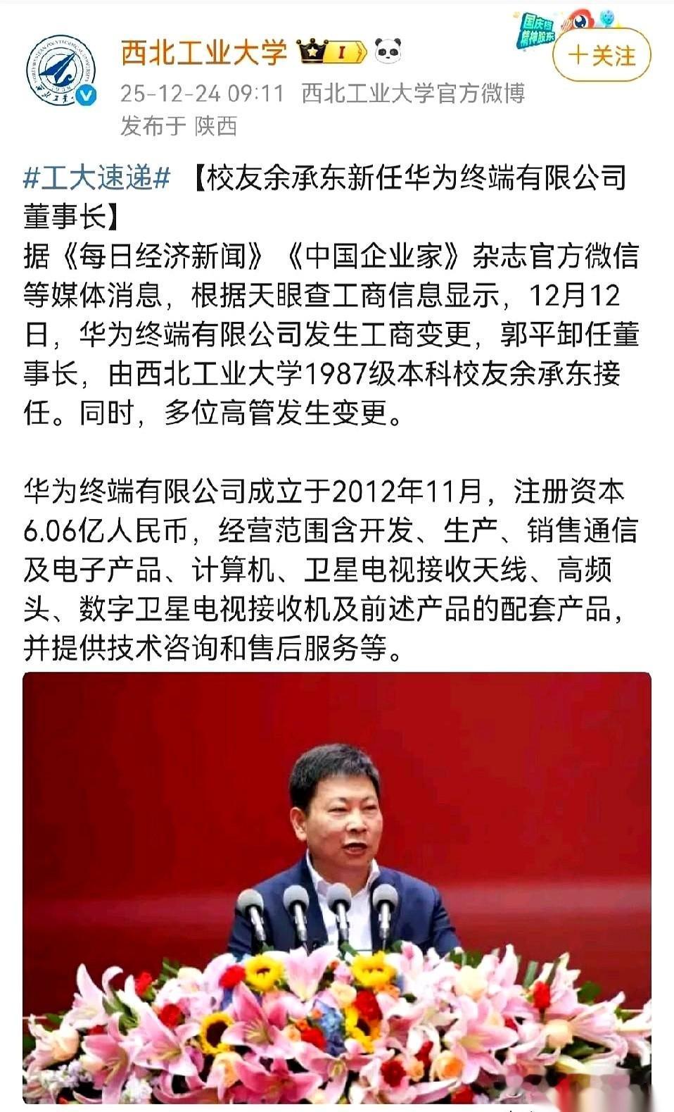 从1993年,干到现在。 余承东,终于成了华为终端公司的董事长。 三十年啊。兄弟。 你想想,从一个青葱少年,干到两鬓斑白。现在多少人三年跳五回槽,人家在一个地方,一个坑里,死磕了整整三十年。 这是一种什么精神? 都说一方水土养一方人,这话真不假。翻了翻他的履历,本科,西北工业大学。 懂的都懂。 国防七子之一。这种学校,说白了,就是给国家培养“总师”的摇篮,是干重活、打硬仗的地方。 从这种地方出来的人,骨子里就焊着一股劲儿:认准一件事,那就干到底,不干成不罢休。没有什么花里胡哨,就是实打实,硬碰硬。 这股劲儿,跟华为的气场,简直是天作之合。 所以你看,哪有什么横空出世。 所有你今天看到的牛逼,背后都是你看不到的苦逼坚持。 我们总羡慕那些一夜成名的神话,但真正让人肃然起敬的,其实是这种择一事、终一生的执着。选对了路,然后用一辈子去走完它。 这听着很老土,但做起来,真TMD酷。