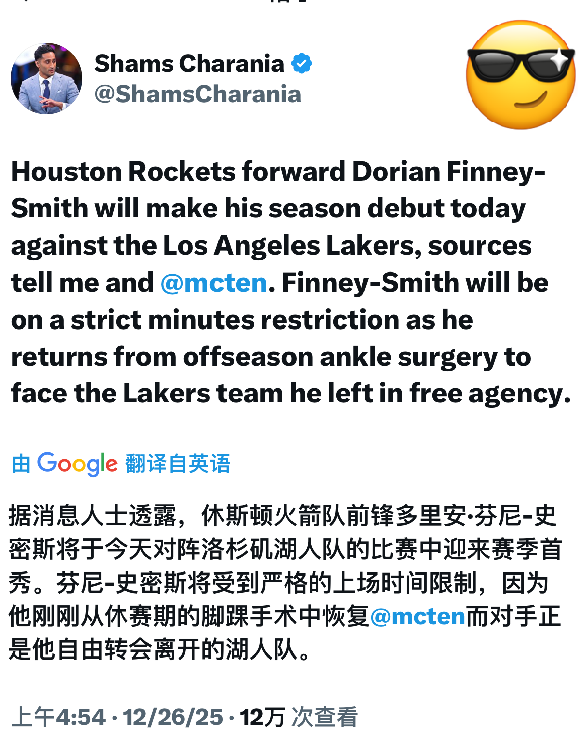 终于,火箭队今年休赛期用中产合同签约的芬尼-史密斯,将会在火箭和湖人的圣诞大战中复出。 在之前火箭队的伤病名单中,芬尼-史密斯才第一次从伤病状态变为出战成疑。 而这之后不久Shams就确认了这一消息,明确表示芬尼-史密斯会出战比赛,不过将有着严格的出场时间限制。 在今年休赛期的时候,芬尼史密斯接受了脚踝手术,而他复出的第一场比赛,就是要迎战去年他的老东家湖人队!去年在湖人队,芬尼-史密斯场均能得到7.9分4.1篮板。