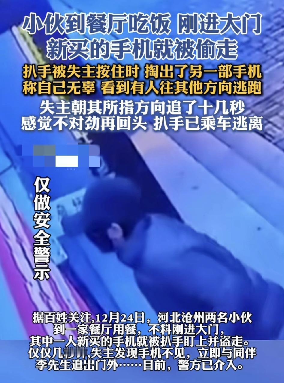 河北沧州,两名男子刚进入餐厅准备用餐时,就被一名扒手偷走了手机。男子发现之后立即追出去,把扒手按在地上,扒手掏出的是另外一部手机说自己无辜。扒手还声称有看到有人朝着另外的方向跑,失主于是追着另外的方向,发现不对劲再回头时,之前的扒手已经不见了踪影。