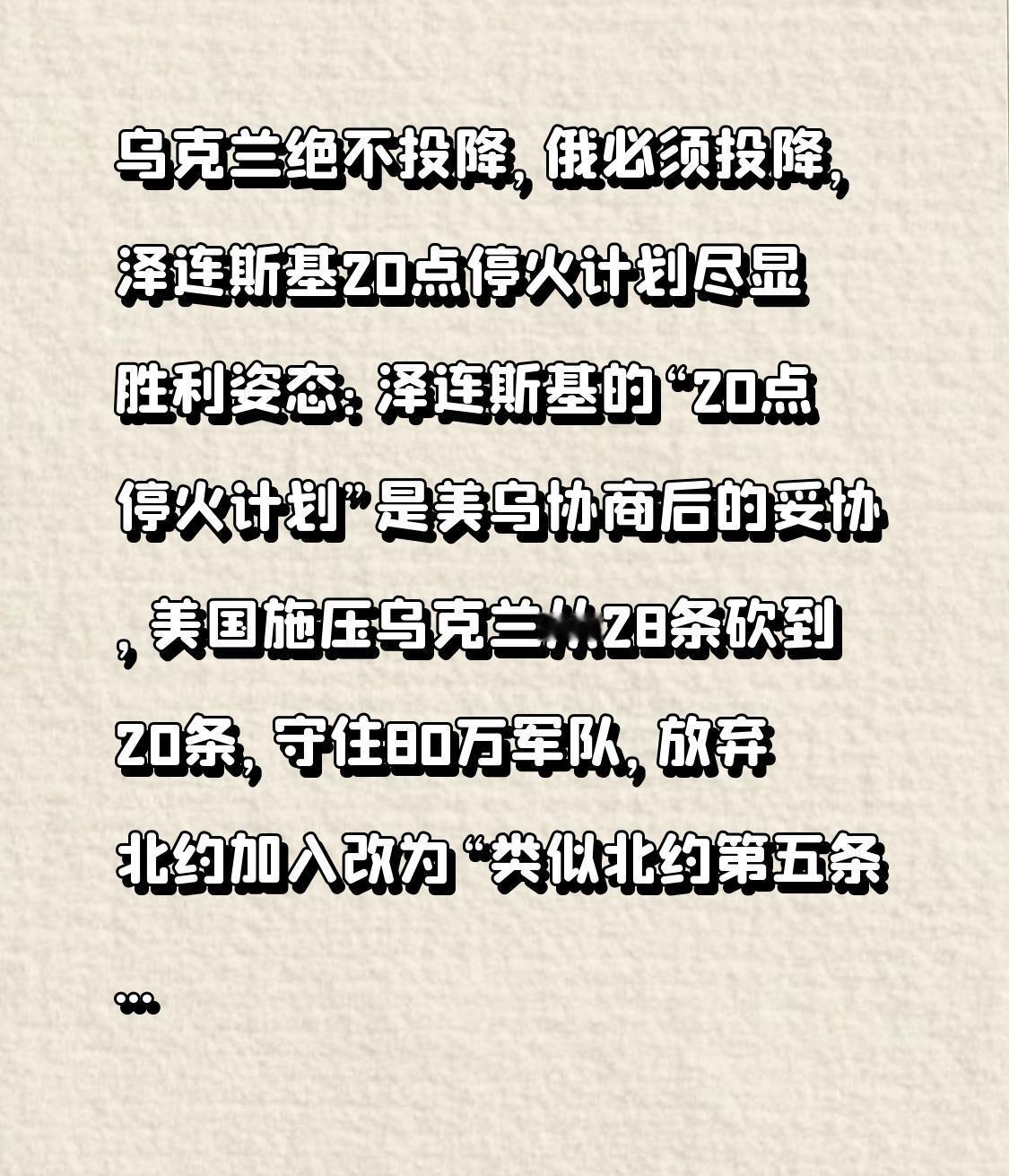 乌克兰绝不投降,俄必须投降,泽连斯基20点停火计划尽显胜利姿态:泽连斯基的“20点停火计划”是美乌协商后的妥协,美国施压乌克兰从28条砍到20条,守住80万军队,放弃北约加入改为“类似北约第五条”安全保障,领土提“自由经济区”模糊处理,俄罗斯反应冷淡,是各方妥协的权宜之计。