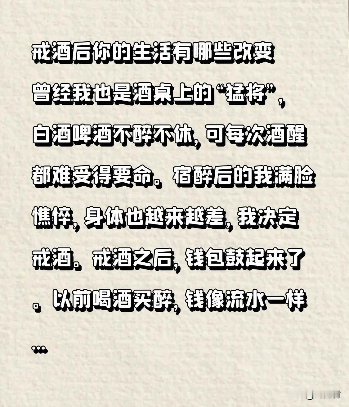 戒酒后你的生活有哪些改变 戒酒后你的生活有哪些改变 曾经我是酒桌“猛将 白酒啤酒不醉不休 每次酒醒难受要命 宿醉后我满脸憔悴 身体也变得越来越差 于是我决定戒酒 戒酒之后 钱包渐渐鼓起来 从前买醉花钱如流水 如今省下不少 能买好多喜欢之物 身体开启“修复模式” 肝脏开始自我修复 肠胃不再翻江倒海 睡眠质量大幅提升 每天都精神饱满 工作效率变高 老板对我刮目相看 社交圈也更有意义 从前酒肉朋友成群 现在身边皆是同道之人 大家一起运动学习 生活充实又快乐 戒酒 让我过上“人间清醒”的生活 戒酒 戒酒控酒 戒酒戒断反应 酒鬼戒酒 戒酒小技巧