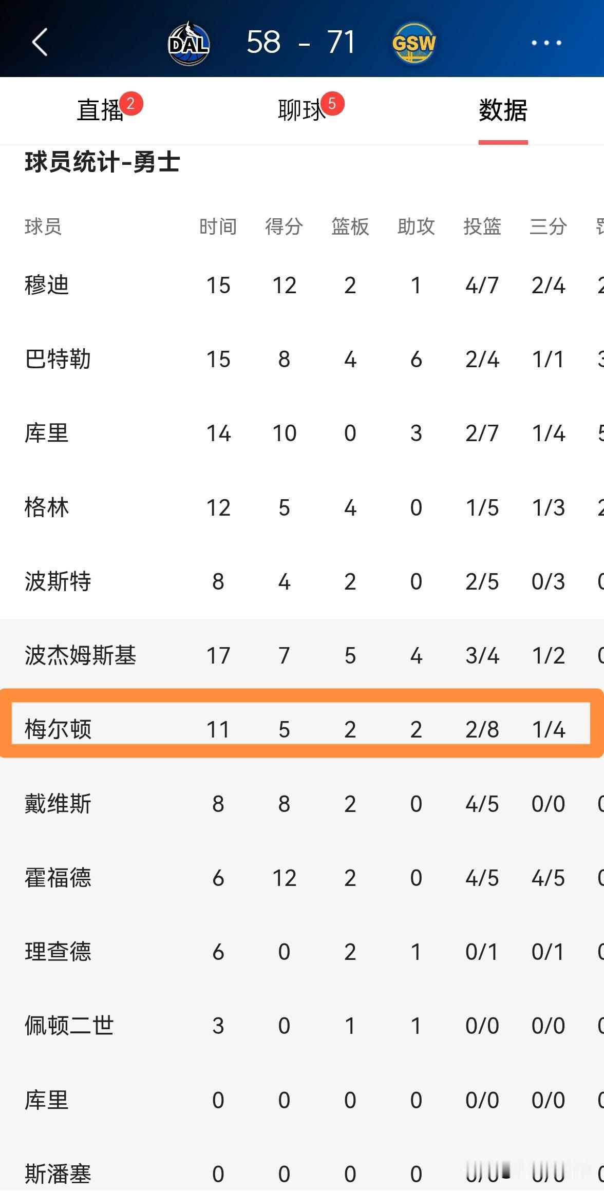 勇士大将梅尔顿真是太敢投了!在今天勇士主场迎战独行侠的上半场比赛中,梅尔顿替补出战11分钟,投篮8中2,其中三分球4中1非常低效的得到5分,不过他的场上正负值为全队最高的+18,帮助球队以71:58领先独行侠结束了前两节的比赛。 作为一名替补球员,梅尔顿在短短的11分钟出场时间里就出手了8次,他的出手次数高居全队第一,不得不说梅尔顿是真敢投,也真敢投不进。