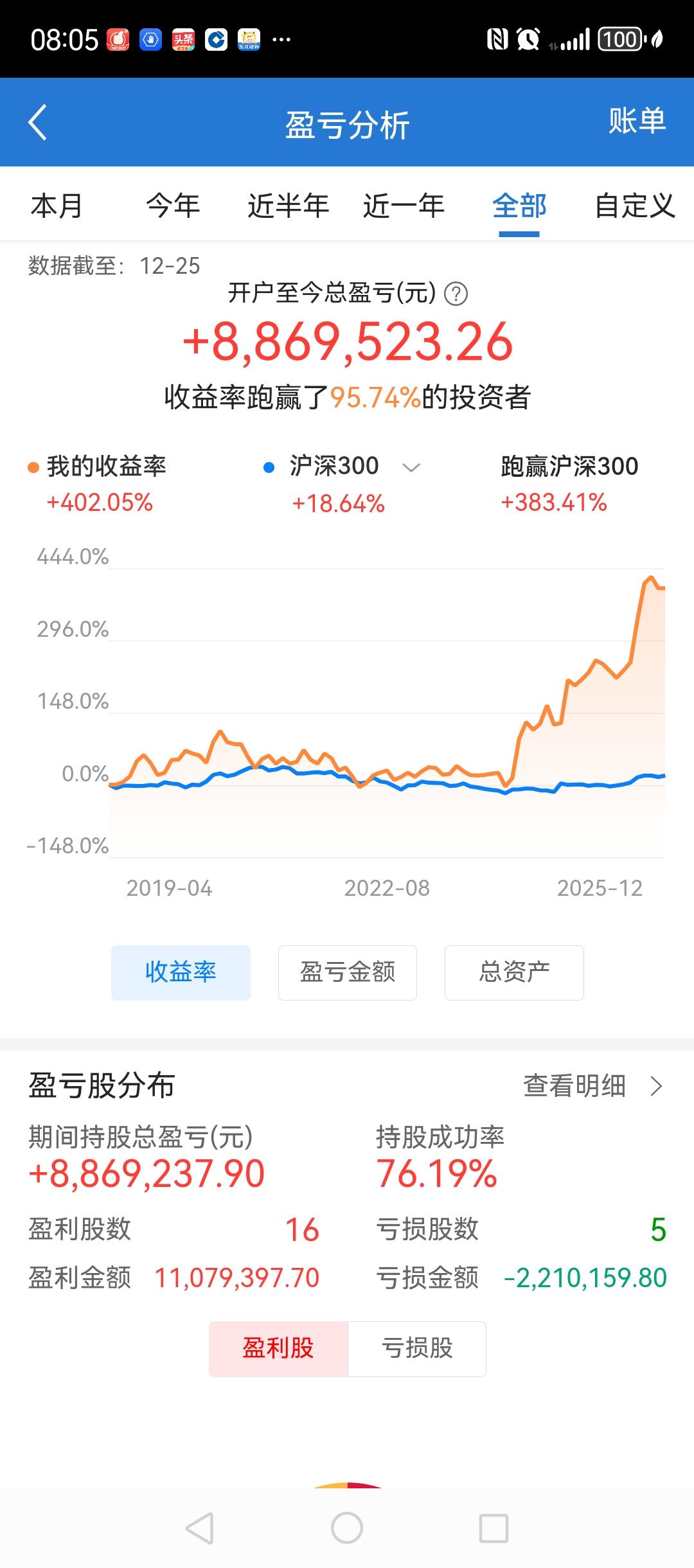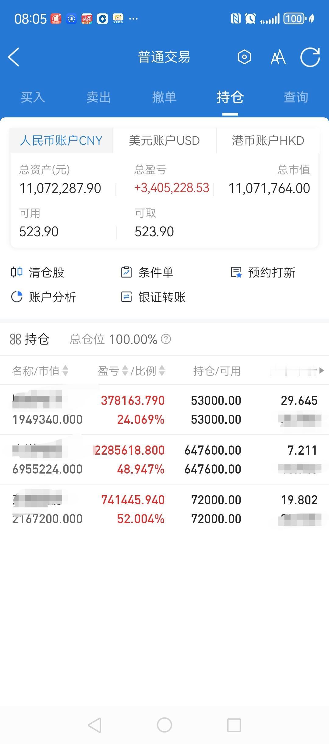 这个账户收益最高的时候,利润突破了1000万,现在是将近900万。经过昨天的上涨,账户资产重新回到1100万以上,累计收益也再次突破400%。但距离今年10月份500%的收益还有一点距离。 目前账户上的三个股票,持有时间均在一年左右,甚至一年多一点的时间。 真正的卖点,是这些股票出现了一个上涨加速而上涨乏力之后。股票较短的时间之内出现较大幅度的上涨,而接下来的一段时间有可能出现横盘甚至下跌,这就是我们卖出的时候。