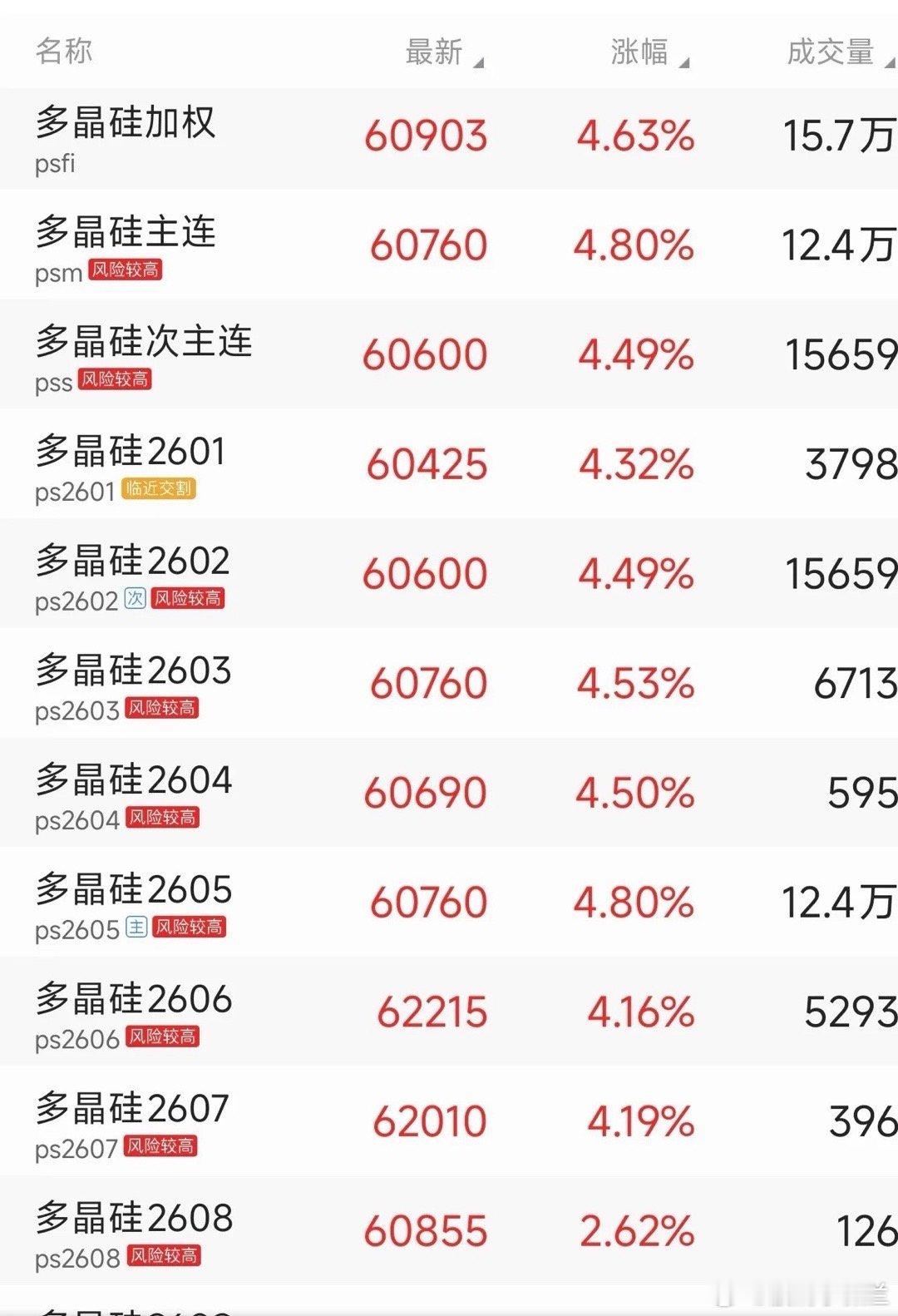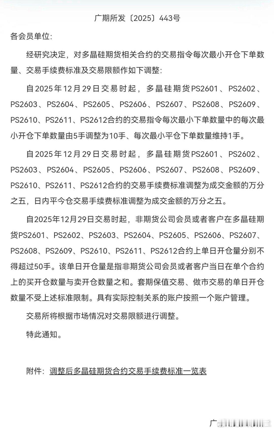 多晶硅大涨,广期所再下狠手——最小开仓数量调整为10手,大幅上调手续费至万分之五!12月25日,广期所多晶硅期货各合约大涨超过5%,各合约重新站上60000元/吨之上。晚间,广期所再度出台措施,这个措施出手更狠。一,最小开仓下单数量调整为10手,平仓仍然为1手。多晶硅期货1手3吨,10手就是30吨,当前期货价格60000多,10手合约价值180多万元,交易所保证金11%,以平均15%的保证金计算,投资者账户开仓门槛需要27万以上的保证金。这把很多小散户挡在外面了。二,大幅调整交易手续费为万分之5,双边收取。按照一手合约价值18万计算,开仓和平仓手续费180元。同向波动6个价位,才能覆盖手续费,这个太狠了。这对多空双方都不利,加大了盈利难度,加大了亏损的风险。三,非期货公司会员或者客户单日开仓不得超过50手。这个对高频交易,量化交易的投资机构影响极大。广期所近期对多晶硅,碳酸锂,铂,钯期货交易持续出台多项措施,试图给交易降温,效果不明显。估计广期所现在也头痛,12月19日,多名做空多晶硅亏损的投资者去广期所面谈。