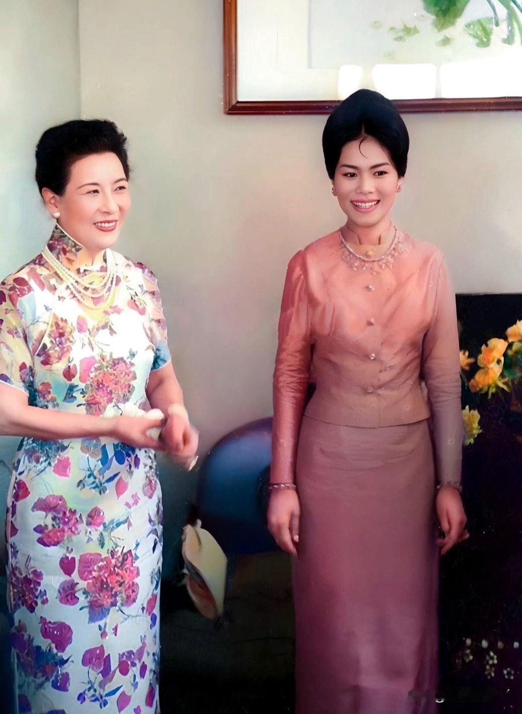 一九六三年,泰国王后诗丽吉访台期间,宋美龄全程陪同并与诗丽吉合影留念。这可不是演戏,也而非影视剧里的演员,确是货真价实的本人,二人外貌清晰可辨!彼时诗丽吉三十一岁,宋美龄六十六岁,大家瞧瞧呗!不要被影视剧中的美貌迷惑,看看宋美龄的真实貌相吧。