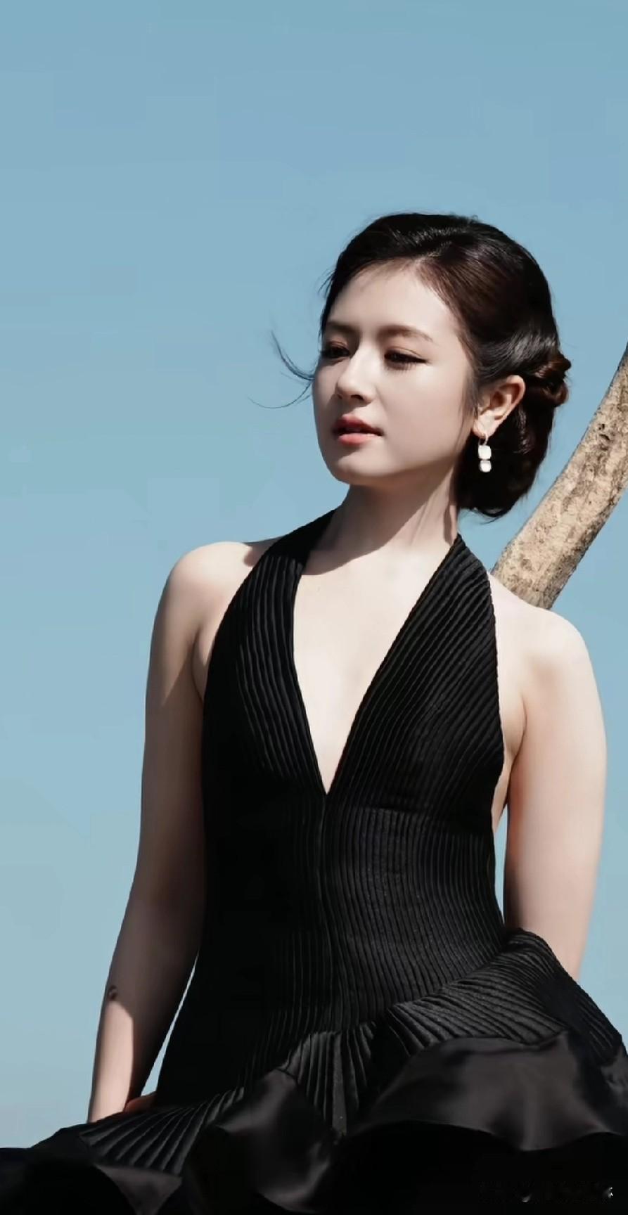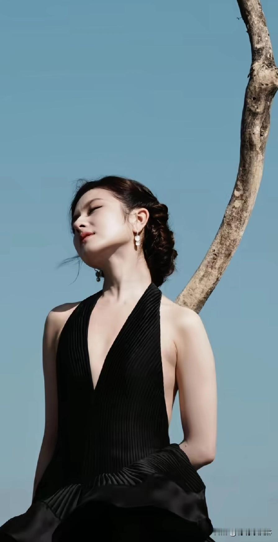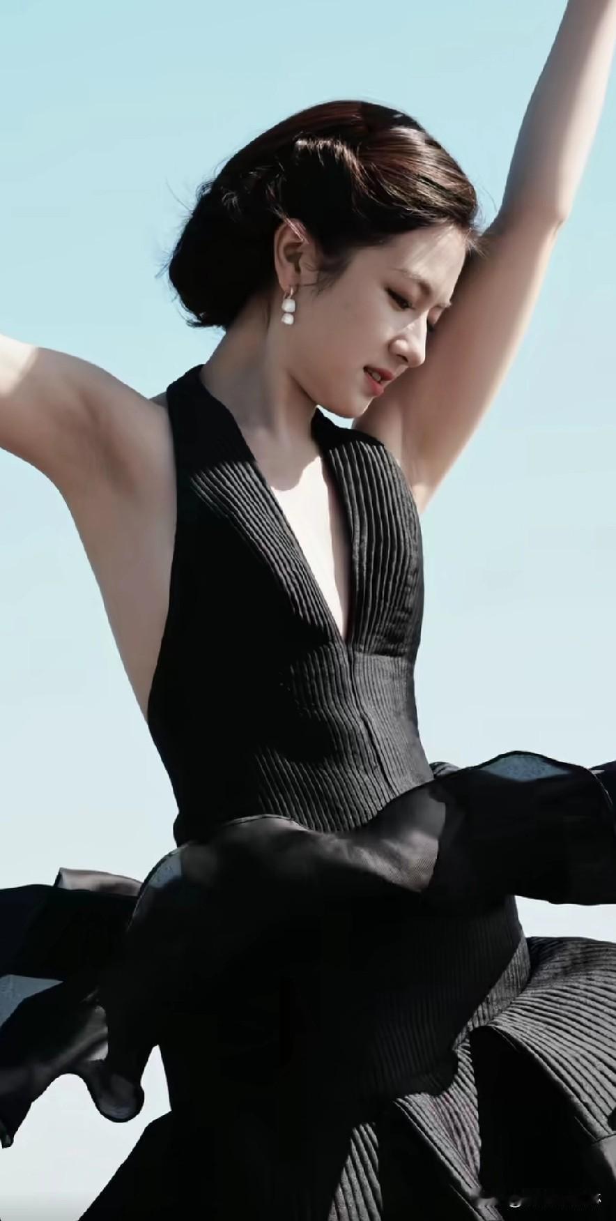 优雅黑裙舞者,在蓝天背景下翩翩起舞。——李兰迪
