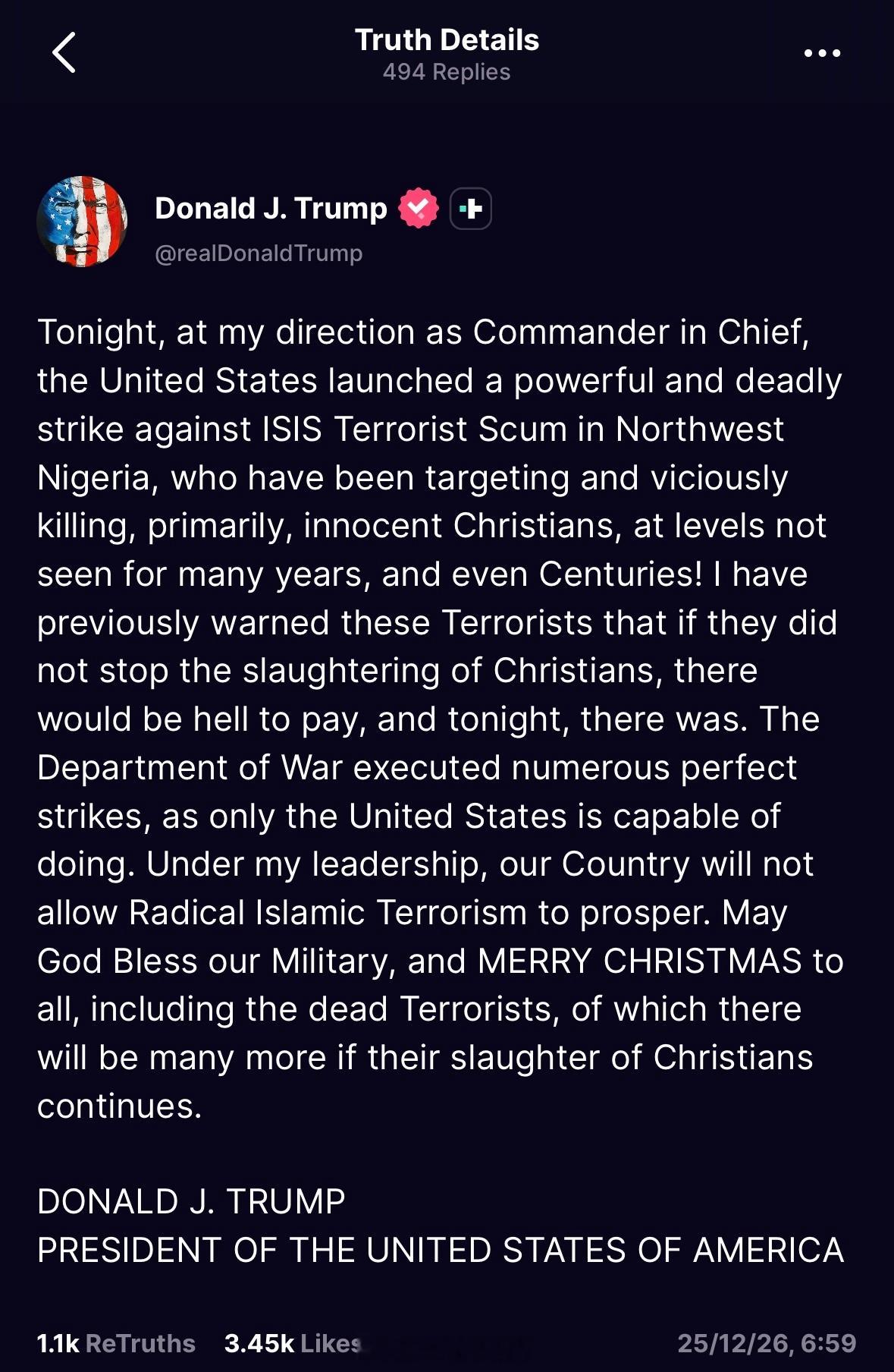 特朗普发文,美国对尼日利亚发动军事打击今晚,在我作为总司令的指挥下,美国对尼日利亚西北部的“伊斯兰国”恐怖分子发动了强大且致命的打击。这些恐怖分子一直在针对无辜的基督徒进行袭击和残忍杀害,其程度多年未见,甚至数百年来都未曾有过。我此前已警告过这些恐怖分子,如果他们不停止对基督徒的屠杀,必将付出沉重代价,今晚,他们就尝到了苦果。战争部实施了多次精准打击,只有美国才能做到如此。在我的领导下,我们的国家绝不会允许激进伊斯兰恐怖主义得逞。愿上帝保佑我们的军队,祝所有人圣诞快乐,包括那些死去的恐怖分子,如果他们继续屠杀基督徒,还会有更多恐怖分子丧命。 唐纳德·J·特朗普,美利坚合众国总统全网热点共创计划热点现场