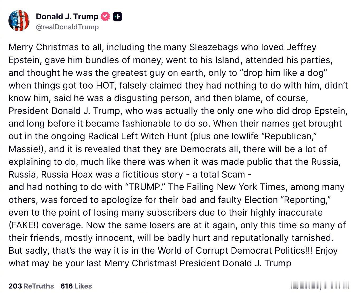 阿川发帖拜年:大家过年好,也包括那些曾经崇拜杰弗里·爱泼斯坦的众多卑鄙小人……他们参加过他的派对,认为他是世界上最伟大的人,但当事情变得棘手时,他们就“像甩掉狗一样甩掉他”,还谎称自己与他没有任何关系……
