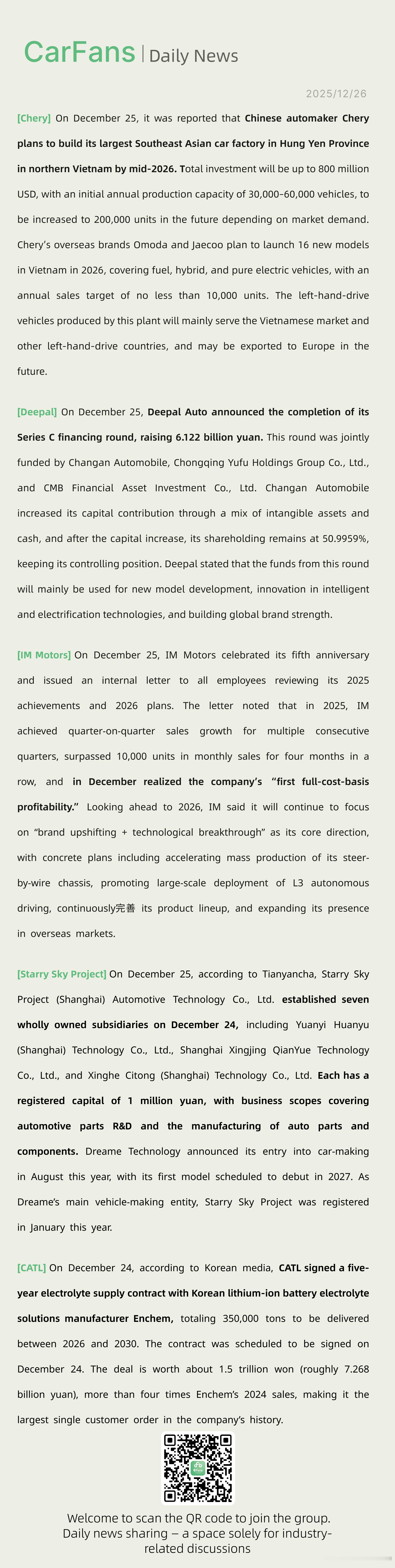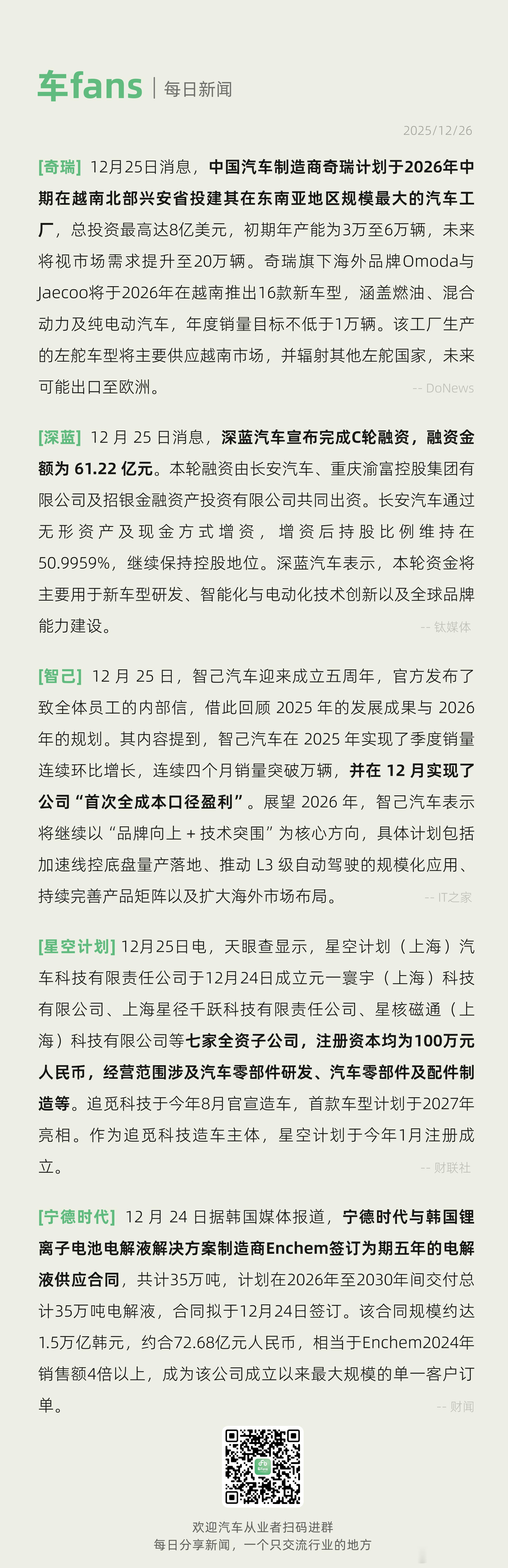 奇瑞计划于26年中期在越南投建汽车工厂、12月实现“全成本口径盈利”智已汽车迎来成立五周年,官方发布了致全体员工的内部信,借此回顾 2025 年的发展成果与 2026年的规划。其内容提到,智己汽车在 2025 年实现了季度销量连续环比增长,连续四个月销量突破万辆,并在12月实现了公司“首次全成本口径盈利”。展望 2026年,智己汽车表示将继续以“品牌向上+技术突围”为核心方向,具体计划包括加速线控底盘量产落地、推动L3 级自动驾驶的规模化应用持续完善产品矩阵以及扩大海外市场布局。智己大电池增程这条路的红利赚到了新能源汽车