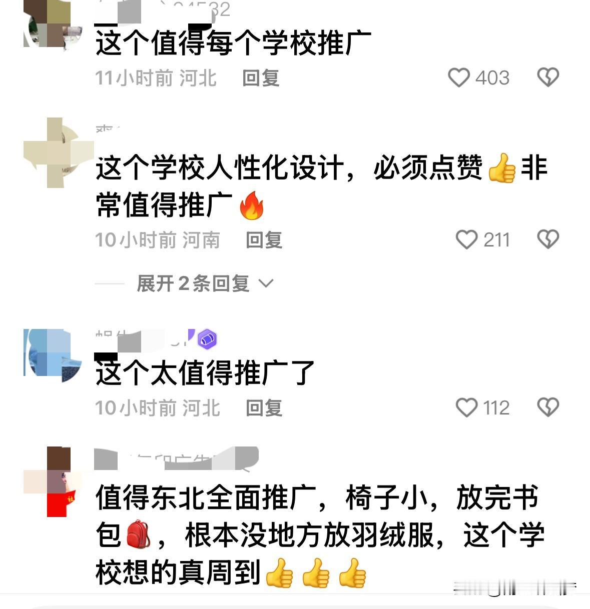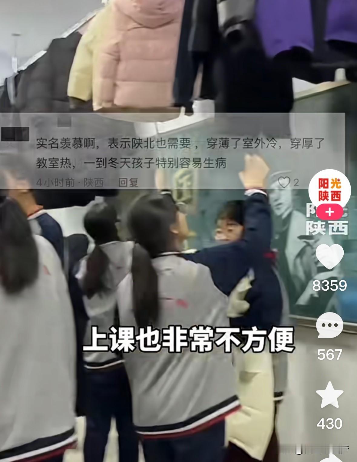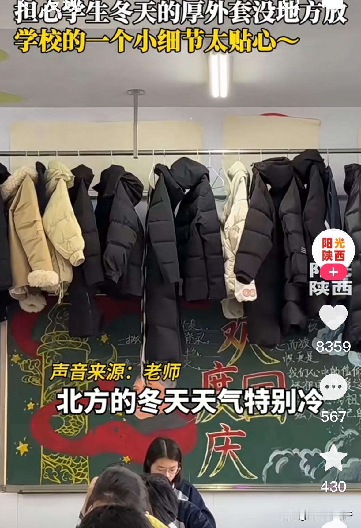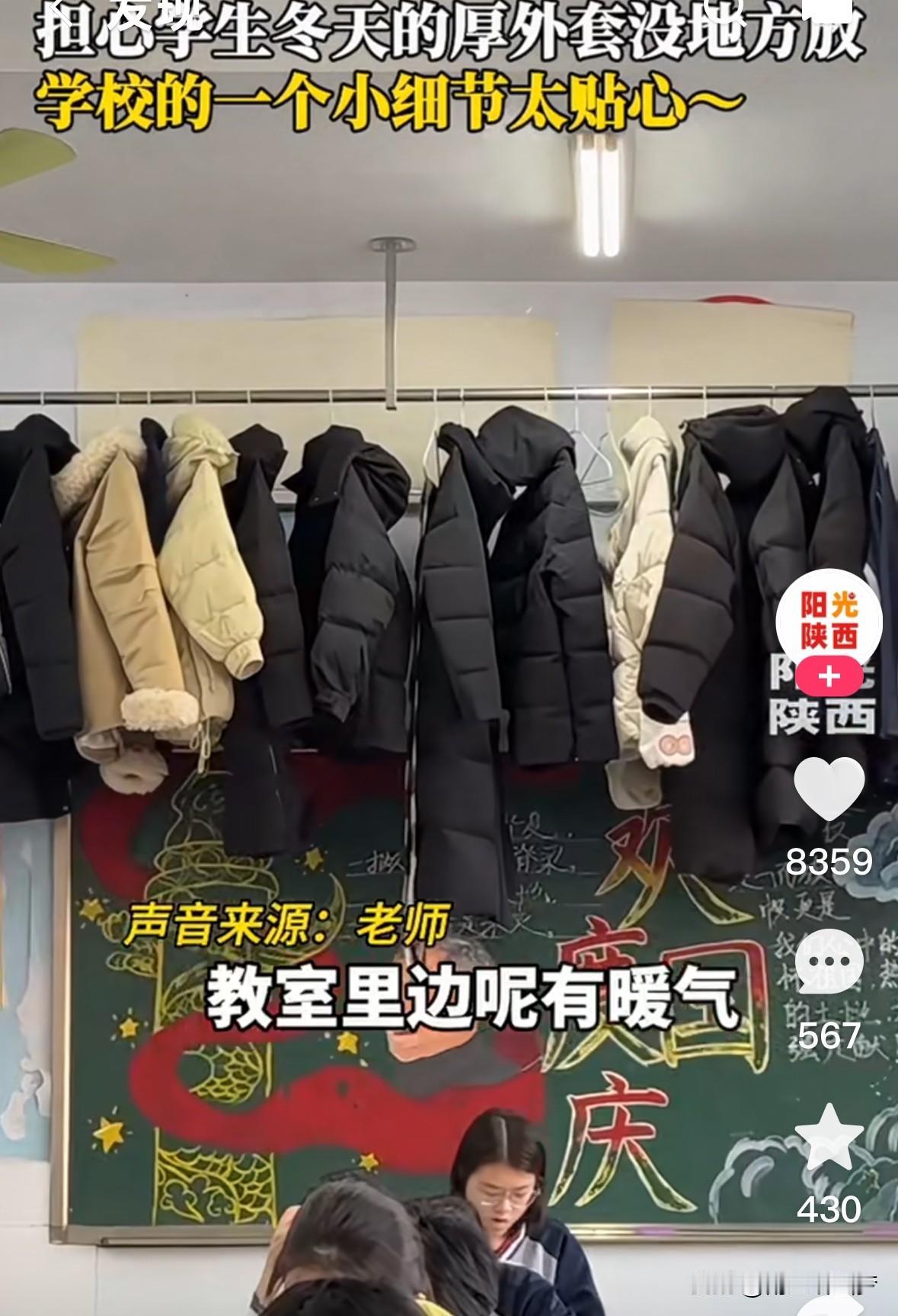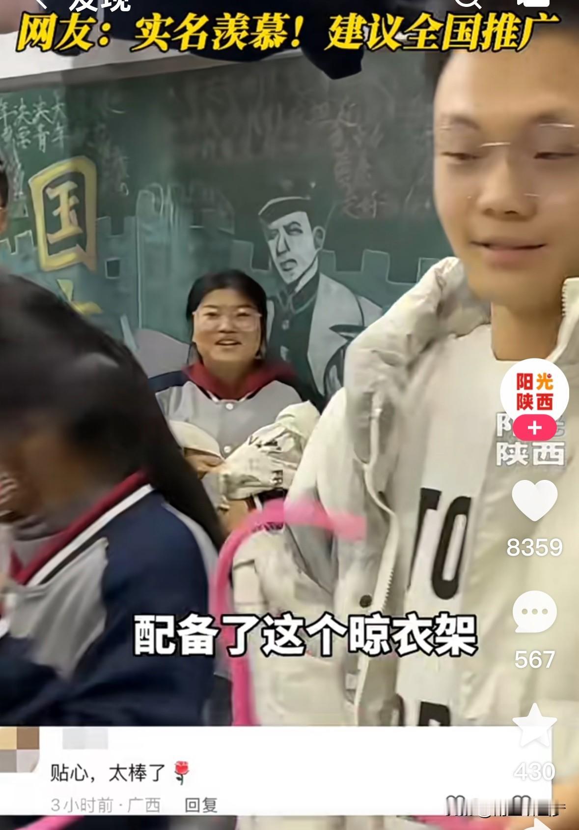 一个晾衣架火遍全网!北方孩子的冬天难题,竟被这个学校的暖心小细节解决了 你有过这样的困扰吗?——北方冬天教室里暖气十足,孩子穿着厚羽绒服热得冒汗,脱下来却没地方放,堆在椅子上占地方,放地上又容易脏。这不仅是家长的烦心事,更是孩子们每天都要面对的小难题。 最近,山东德州一所学校的做法,让全国网友直呼“羡慕”!原来,学校在教室后方统一安装了晾衣架,让学生们的厚外套有了“安身之处”。视频里,一排羽绒服整齐悬挂,教室不再凌乱,孩子们也能轻松舒适地听课。 这个看似微小的改变,却戳中了无数人的心。评论区瞬间沸腾: · “实名羡慕!建议全国推广!” · “太贴心了!我们陕北也需要,孩子冬天穿脱不当特别容易感冒。” · “终于有学校注意到这个问题了,书包放椅子上,衣服根本没地方搁。” · “人性化的细节,这才是真正为孩子着想的学校。” 一个小小的晾衣架,背后是教育者对孩子们日常需求的细致观察和真心关怀。它解决的不仅是衣物存放的问题,更守护了孩子们的健康,也让教室变得更加整洁有序。教育,不就是藏在这样温暖的细节里吗? 你家孩子的学校有类似的贴心设计吗? 你觉得这个“教室晾衣架”值得推广吗? 来评论区聊聊,一起为更用心的教育细节点赞!