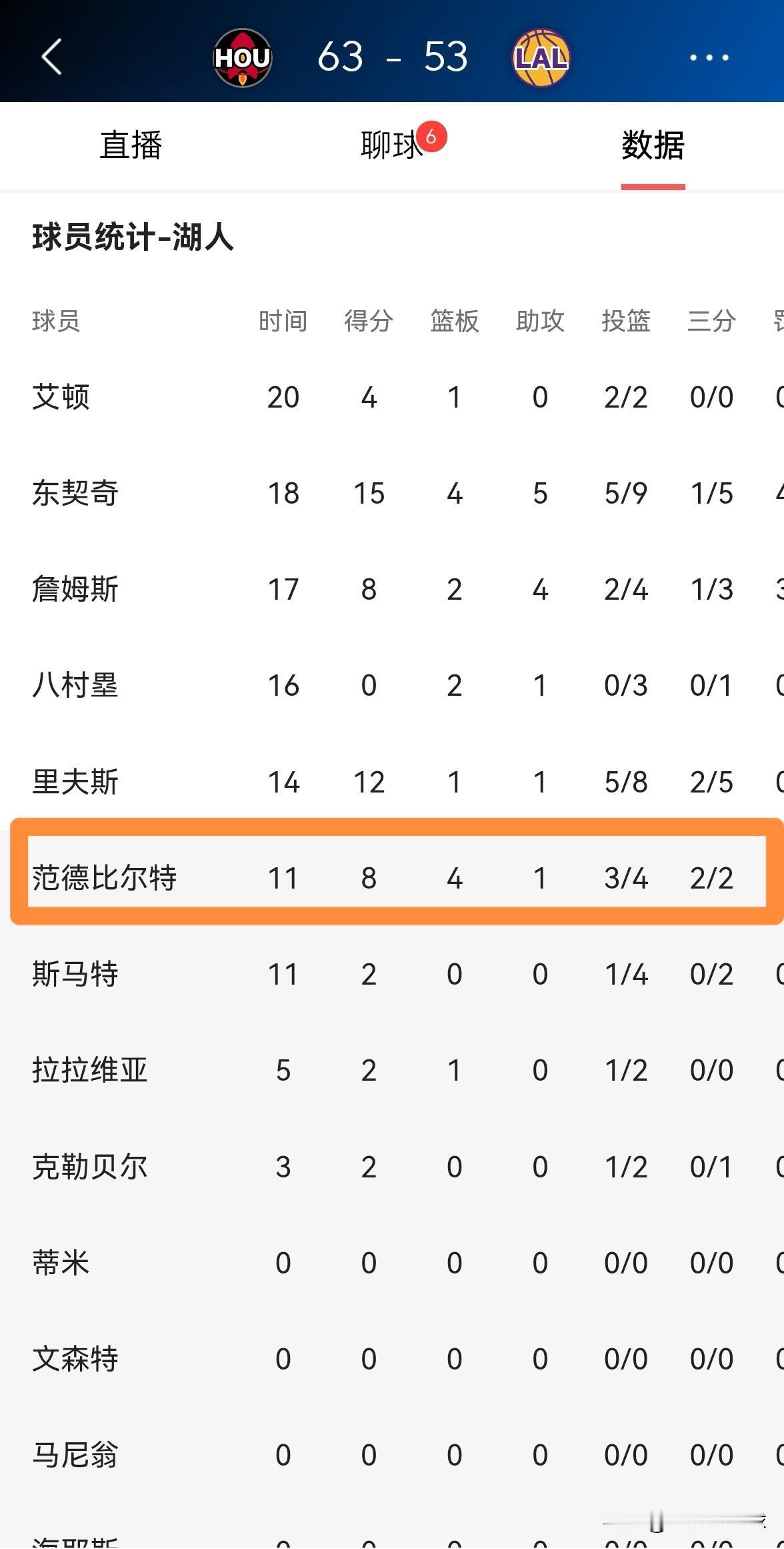 湖人大将范德比尔特真是太让人喜出望外了!在今天湖人主场迎战火箭的上半场比赛中,范德比尔特在攻防两端都打出了非常出彩的表现,他在替补出战的11分钟里,投篮4中3,其中三分球2中2非常高效的砍下8分4篮板1抢断,没有出现任何的失误,他的场上正负值为+1。 虽然湖人以53:63落后对手结束了前两节的比赛,但是范德比尔特在前两节比赛中的表现是无可争议的。