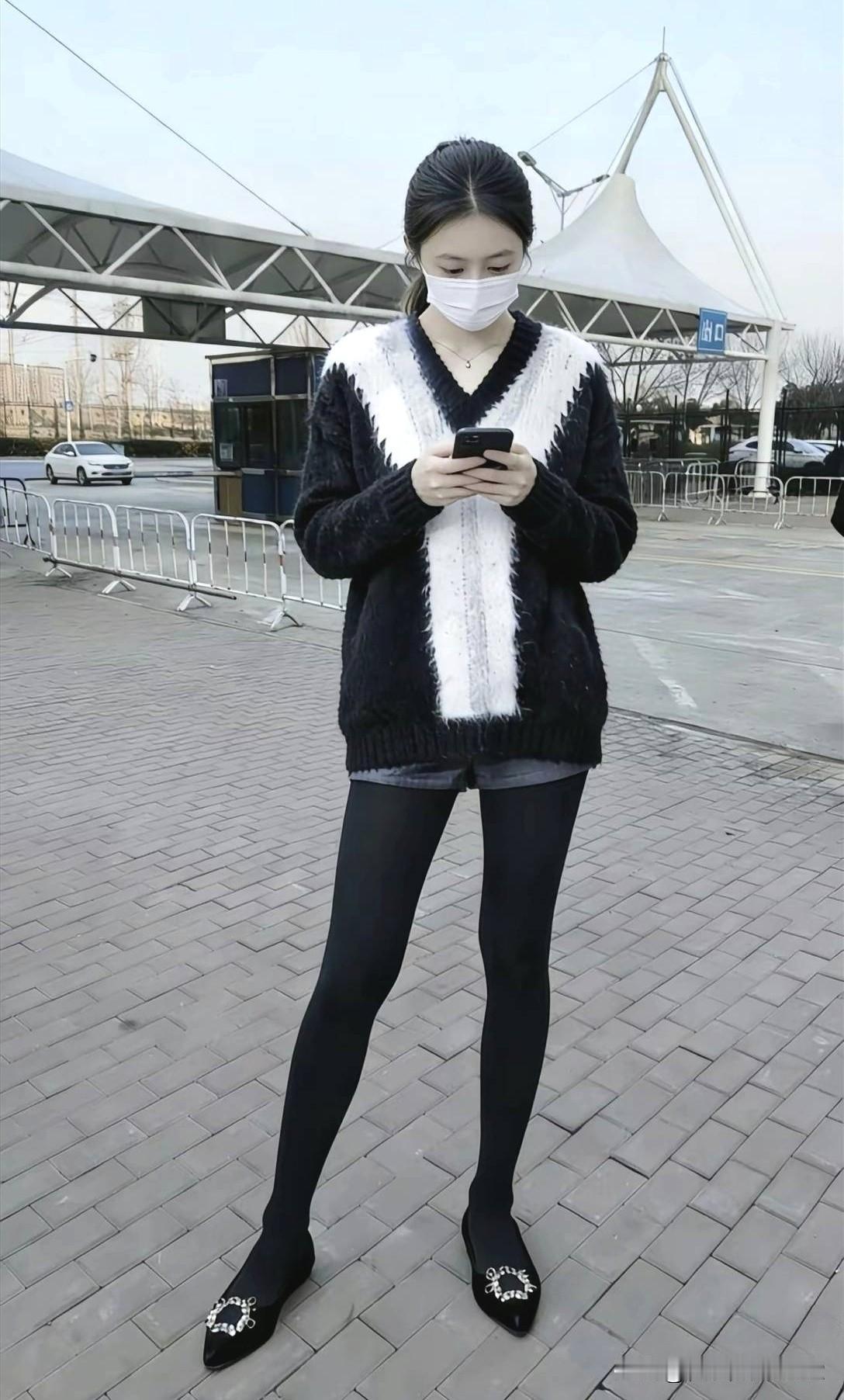 冬日穿搭指南:黑白撞色毛衣+黑色丝袜+闪亮乐福鞋,简约又时尚
