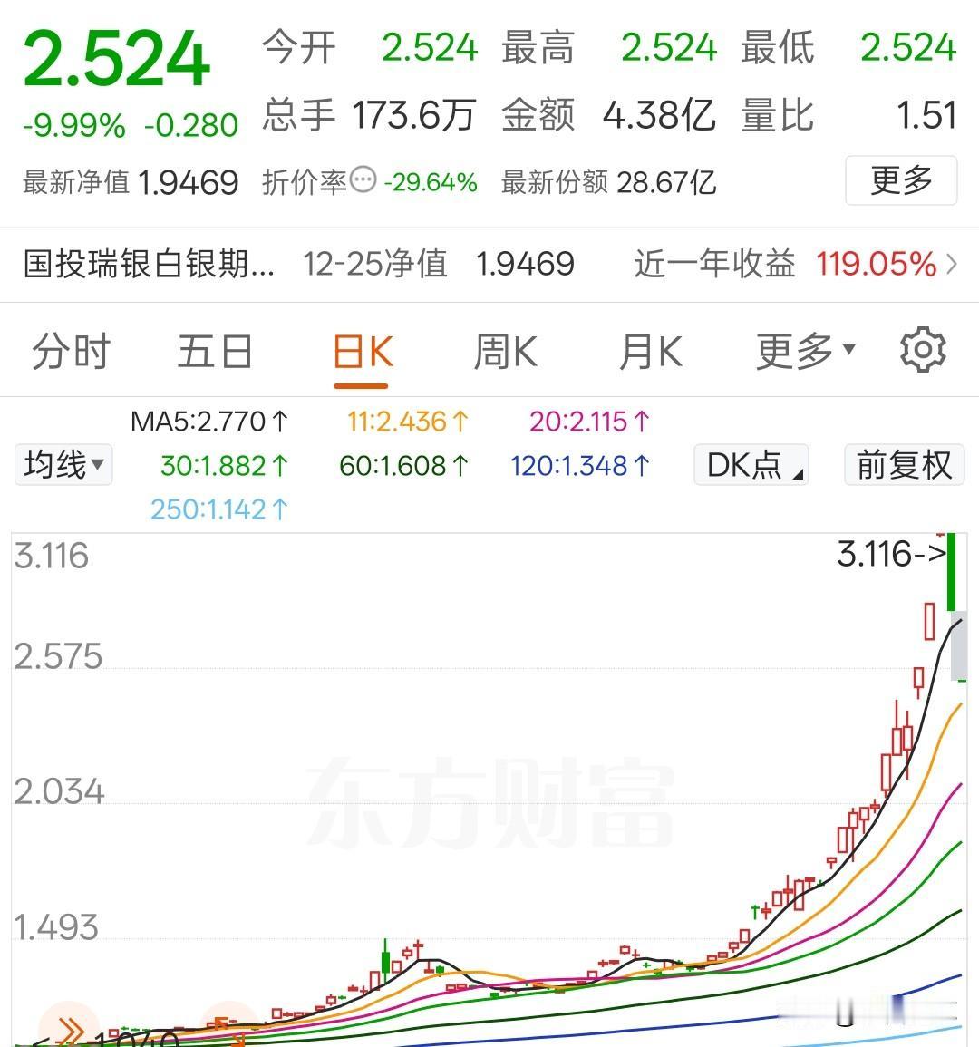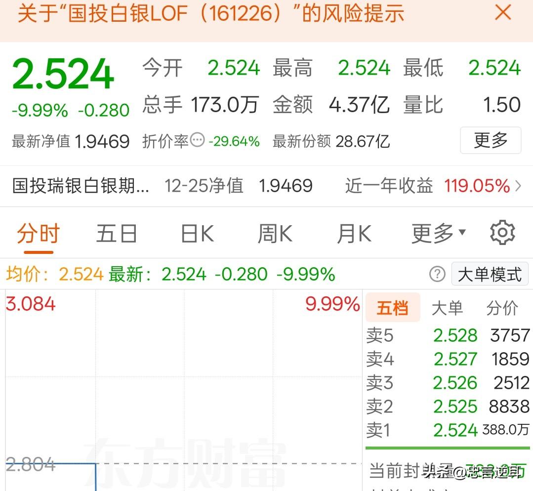 国投白银LOF,今天能打开跌停吗 三个涨停后,又来连续两个跌停,且巨量封单,今天能打开吗? 国投白银LOF,在三个涨停后,连续两天巨量跌停,溢价率从原来的65%骤降到29.64%,风险释放不少。 它后期还有机会吗? 大概率还会有,一方面,白银期货还在涨,白银股也在涨,它每份收益也在稳步提高;另一方面,现在就吹泡沫的行情,经过两天跌停,溢价率大幅回撤,风险偏好资金不会就此收手。 乐观估计,今天就能打开跌停。但是这些东西,不是散户能玩的,还是看戏吧!