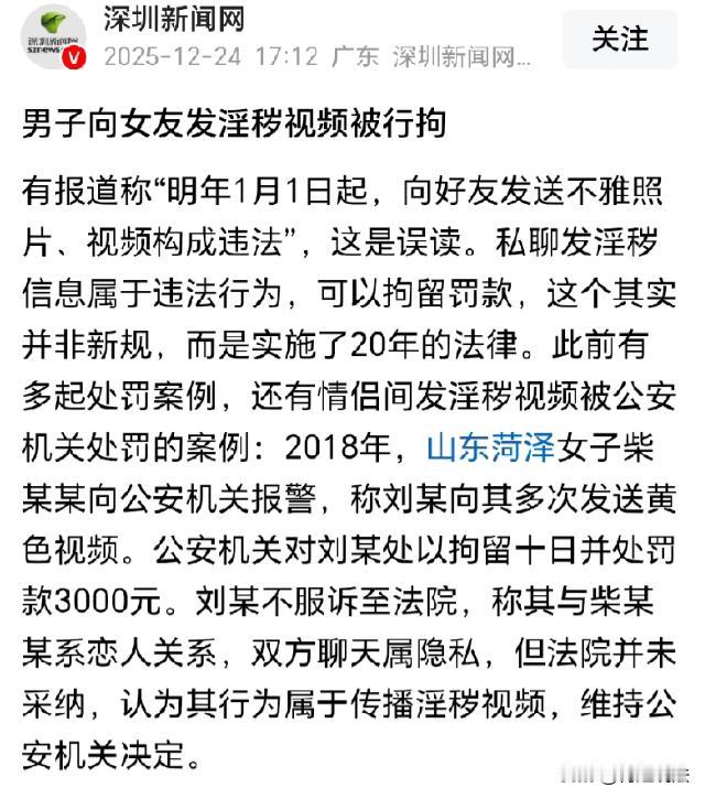 山东菏泽,一男子为增进和女友感情,竟给女友发淫秽视频,可女友不仅不买账,还报了警,男子因此被拘留10日,还被罚款3000元。男子不服,觉得情侣间聊天内容是隐私,不算违法犯罪,便向法院起诉,请求撤销处罚。法院审理后,最终给出了判决。 (来源:深圳新闻网) 刘某和柴某某相识于一场朋友聚会,当时刘某对柴某某一见钟情,展开热烈追求。 柴某某被刘某的真诚打动,两人很快确定了恋爱关系。 恋爱初期,两人如胶似漆,刘某却觉得感情升温速度不够快,他绞尽脑汁,想出给柴某某发黄色视频这个自认为绝妙的主意,以为这样能让两人关系更亲密。 刚开始,刘某只是试探性地发了一两个视频,柴某某收到后,心里十分反感,但碍于情面,只是委婉提醒刘某别再发了。她觉得情侣之间应该相互尊重,这种低俗内容实在不合适。 可刘某却把柴某某的提醒当成耳旁风,不仅没有收敛,反而变本加厉。他觉得柴某某的反应是害羞,于是发送频率大幅提高,视频内容也越来越不堪入目。 柴某某多次劝说无果,实在无法忍受这种行为,觉得刘某根本不尊重自己,两人的感情也岌岌可危了。 在又一次收到视频后,柴某某忍无可忍,报了警。 民警收集了刘某发送的视频证据,认定刘某的行为构成传播淫秽视频。依据相关法律法规,对刘某作出了拘留10日、罚款3000元的处罚决定。 刘某收到处罚决定后,觉得自己和柴某某是情侣关系,聊天内容属于隐私,不应该算违法犯罪。 在刘某看来,自己只是出于增进感情的目的,没想到会触犯法律。 于是,刘某不服处罚决定,向法院提起诉讼,期待能撤销对他的处罚,还自己一个清白。 公安机关提供了详细的证据,包括刘某发送的视频记录、柴某某的报警材料等。他们指出,传播淫秽物品的违法性不取决于传播对象的关系,而在于行为本身是否违反法律规定。 那么,以法律的角度该如何看呢? 根据《治安管理处罚法》第六十八条规定:制作、运输、复制、出售、出租淫秽的书刊、图片、影片、音像制品等淫秽物品或者利用计算机网络、电话以及其他通讯工具传播淫秽信息的,处十日以上十五日以下拘留,可以并处三千元以下罚款;情节较轻的,处五日以下拘留或者五百元以下罚款。 刘某多次向柴某某发送淫秽视频,该行为,完全符合该条款中“利用通讯工具传播淫秽信息”的情形。 虽然刘某和柴某某是情侣关系,但法律并未对传播淫秽物品的对象作出特殊限定,只要是实施了传播淫秽物品的行为,就违反了此条规定。 刘某在柴某某明确表示反感并提醒后,不仅没有停止,反而变本加厉,发送频率大幅提高且内容愈发不堪入目,这种行为显然不属于情节较轻的范畴。 所以,公安机关依据该条款对刘某作出拘留10日、罚款3000元的处罚决定是合理合法的。 虽然公序良俗原则多在民事法律领域体现,但它在整个法律体系都有着重要的指导意义。 刘某向柴某某发送淫秽视频的行为,严重违背了普遍认可的道德规范和价值观念。 情侣之间本应相互尊重、关爱,以积极健康的方式增进感情,而刘某却采用这种低俗、不道德的方式,不仅破坏了情侣间应有的纯洁和美好,也对社会风气造成了不良影响。 这种行为,使得周围人可能会对情侣关系产生不良认知,影响大众对情感关系的判断,从广义上来说,对公共秩序和善良风俗造成了冲击,具有社会危害性。 根据《民法典》第一百零九条规定:自然人的人身自由、人格尊严受法律保护。 人格尊严权是指自然人享有的,基于人格自由、人格平等、人格独立、人格尊严而产生的,以人格利益为内容,并排除他人非法侵犯的权利。 柴某某明确表示对刘某发送淫秽视频的行为反感,这是她维护自身人格尊严的体现。 刘某不顾柴某某的反对,持续发送淫秽视频,实际上是对柴某某人格尊严的一种侵犯。 这种侵犯虽然不直接表现为身体上的伤害,但对柴某某的心理和精神造成了极大的伤害,使她在感情中处于一种被冒犯、不被尊重的境地。 虽然公安机关的处罚主要依据的是治安管理处罚法,但从民事法律角度,刘某的行为也应当承担相应的民事责任,柴某某有权要求刘某停止侵害、赔礼道歉等。 法院认为,刘某多次向柴某某发送淫秽视频,且在柴某某明确表示反对后仍不停止,这种行为已经对有违公序良俗,并造成了不良影响,具有社会危害性。 法院经过严谨的审理和充分的讨论,最终维持了公安机关对刘某的处罚决定。 从法律层面看,传播淫秽物品是明确被禁止的行为,无论传播对象是谁,都不能成为逃避法律制裁的理由。 刘某为了增进感情不择手段,最终落得个被处罚的下场,不仅违反了法律规定,也违背了道德准则。 在情侣相处中,尊重是基础,相互理解和包容是关键。不能以爱之名,做出违背法律和道德的事情。 刘某本想通过不恰当的方式增进感情,却因法律意识淡薄,最终得不偿失。