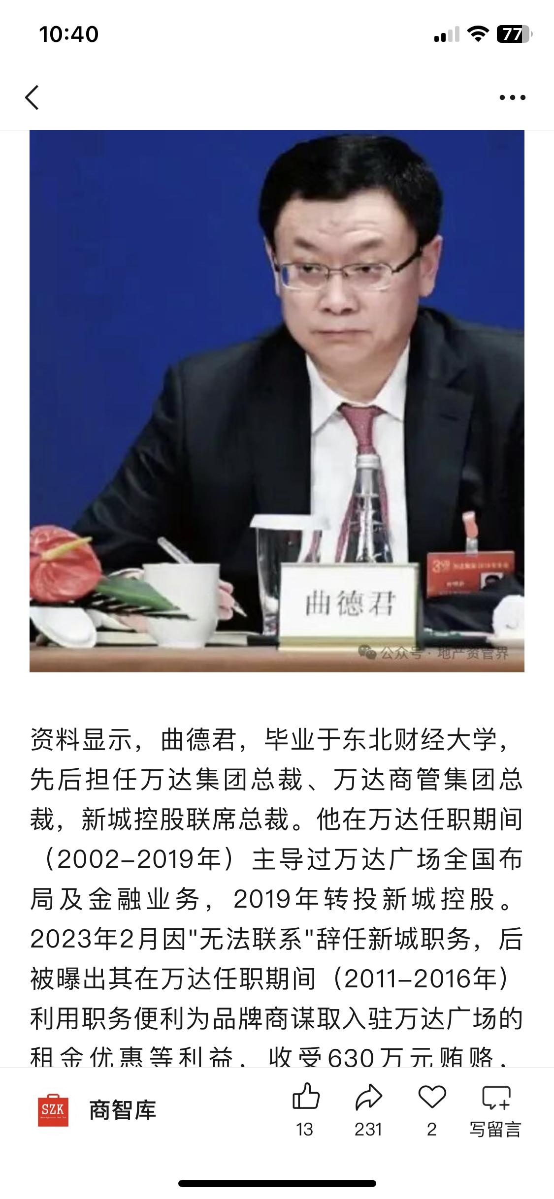 万达系原高管曲得君被判刑,一点不意外。万达这家公司内部文化很差,王健林是公司的国王,高管们普遍在老板面前狗一样卑微,到下属面前一个个呲牙节奏狼一样狠。扭曲的企业文化聚集了一大批品行败坏唯利是图底线全无的地产混子,这家地产出来的高管几乎都非常贪婪,祸害了无数地产公司。然而当年,因为万达商业的火爆,地产业猎头挖人,言必称要万达履历,真的是滑稽至极,于是一个个垃圾地产烂尾项目都出来了。