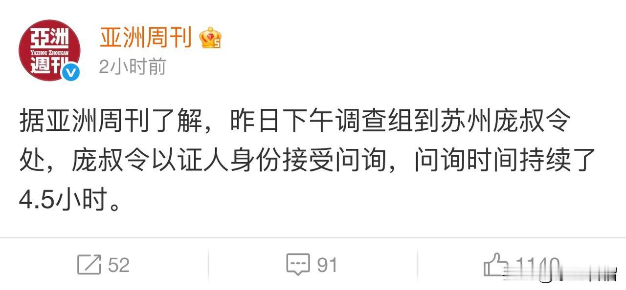 南博文物拍卖案最新消息:已见黎明前的曙光。 据《亚洲周刊》报道,12月25日下午,调查组找到庞氏后人庞叔令女士,庞女士以证人身份接受了调查组问询,问询时长达4.5个小时。 看来国家此次真拿出了将此事彻查到底的态度与决心,甭管你后台多硬,只要违法犯罪,即便你是天王老子也会被揪出来。 对于庞叔令女士以证人身份接受4.5小时问询一事,大家怎么看?欢迎在评论区交流。 (图片来源:亚洲周刊微博截图,网络相关图片)