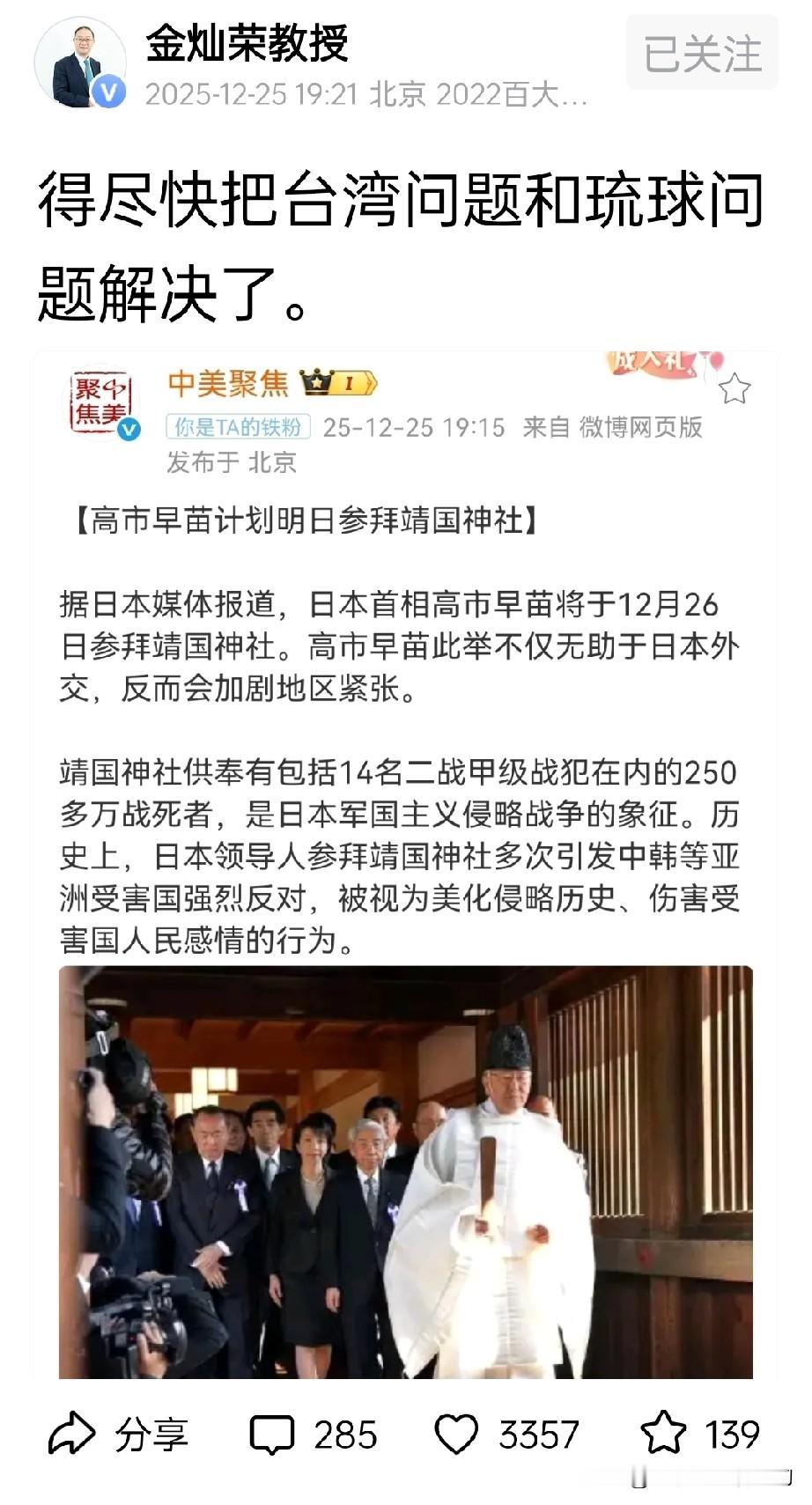 金灿荣昨天晚上七点多发了一张图,写了一句话:得尽快把台湾问题和琉球问题解决了。 到现在为止,下面点赞3338个,评论283个。我觉得,这个点赞量太少,评论也太少了! 虽然只有一张图一句话,但信息量太大了!日本媒体报道,高市早苗今天要参拜靖国“神厕”! 要知道,到目前为止,除了2013年安倍晋三去过一次以外,还没有日本在任首相参拜靖国“神厕”!有的只是让人去送点儿“厕纸”罢了。 高市早苗又想出风头了!这说明前一段她胡言乱语被修理得太轻了!今天我们就拭目以待,如果她胆敢去进入“神厕”,我们必将给以迎头痛击,这次一定让她付出惨重的代价!