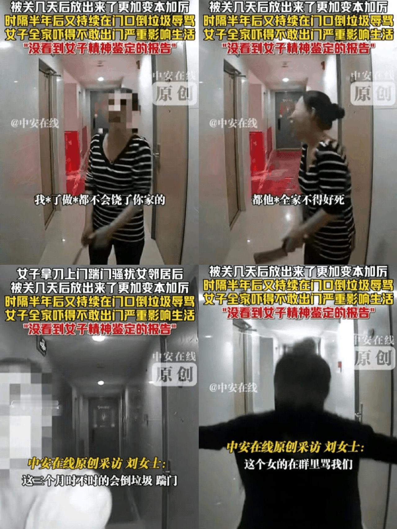 辽宁一女子晚上睡觉,突然听到有人砸门,她以为是邻居喝醉了,结果打开监控一看,竟然是女邻居拿菜刀在砍门,女子害怕报警 结果,女邻居被关几天后,又放出来了,更加变本加厉,持续在她门口倒垃圾辱骂,女子称:全家吓得不敢出门,严重影响生活! 更让人崩溃的是,这不是突发情况,而是持续三个月的噩梦。刘女士买了二手房,没招谁没惹谁,却被女邻居凭空认定“家里有辐射,在攻击自己”,从此平静生活彻底被打破。 门口成了固定垃圾场,烂菜叶、塑料袋堆得臭气熏天,一开门就呛得人喘不过气;女邻居还天天堵在门口辱骂,污言秽语夹杂着恶毒诅咒,声音大到整栋楼都能听见。 好好的新家,硬生生被变成了不敢踏出门的“牢笼”,一家人吃不下睡不着,精神都快被逼到崩溃边缘。 报警后也没解决根本问题,口头教育、短期关押换来的是变本加厉的报复,警察只能劝她“别正面冲突”,可这种被动忍让,只会让受害者更无助。 好在公安局终于立案,还把女邻居送去做精神病鉴定,但鉴定报告没出来,骚扰也没停止。 说真的,精神病人值得同情,他们的行为往往是病情所致,需要家庭和社会的关怀。 但同情绝对不能成为伤害他人的“免罪金牌”,法律既要保障精神病人的权益,更要守住无辜者的安全底线。 根据法律规定,精神病人实施危害他人安全的行为,经鉴定后符合条件的可强制医疗,其监护人也得承担监护责任 。 不能因为“可能有精神病”,就让受害者独自承受恐惧,更不能让“自愿治疗”变成对骚扰的放任。 邻里之间本该和睦相处,可这种无差别骚扰已经超出了容忍边界。受害者的维权不该这么难,希望鉴定结果能尽快出来,给出合理处置,让刘女士一家能早日回归正常生活。 你觉得该如何平衡精神病人的权益与受害者的安全?如果遇到这种邻居,你会怎么应对?