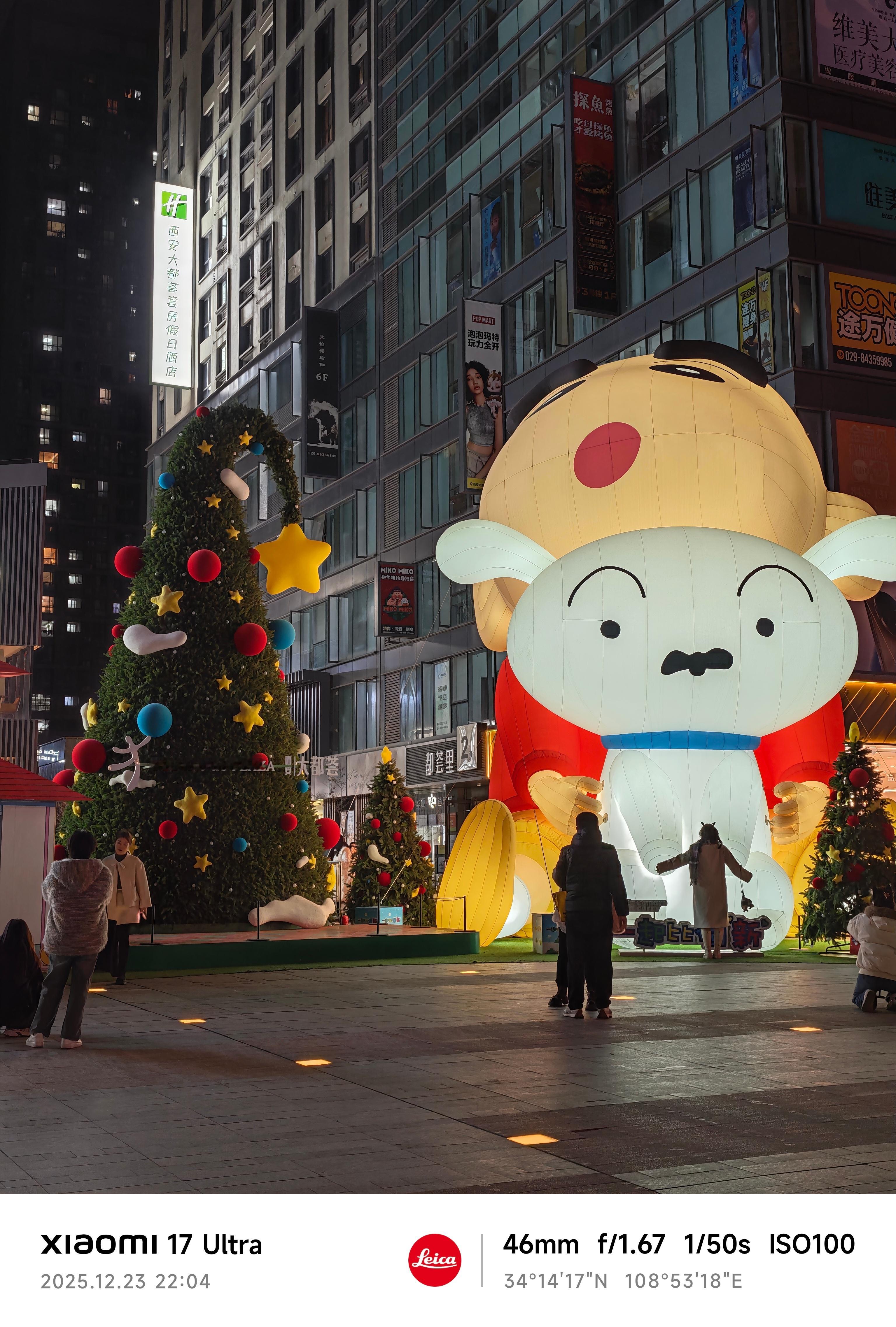 小米 17 Ultra 拍照有多强,我觉得看这个照片就可以了。夜晚环境,图里的环境也很复杂,有前面亮灯的狗,有背后的亮灯的酒店招牌,没亮灯的饭店招牌,最后的小区灯光,你还得给这个圣诞树拍清楚。要么圣诞树清楚了,亮的都过曝了,要么圣诞树一团黑,前面的人、饭店的更是啥也看不清了。两亿加 LOFIC,满足了成年人的既要又要。