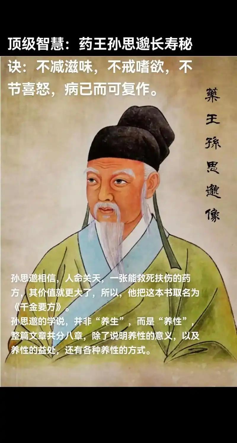 药王孙思邈的十大养生思想,流传千年的长寿秘诀,普通人照着做也受益 从古至今,人人都向往健康长寿,而唐代“药王”孙思邈活过百岁,留下的养生智慧流传千年,至今仍值得我们借鉴。 他的养生理念核心是顺应自然、调和身心,这十大养生思想,普通人照着做就能收获满满。 1. 顺应四时 春养肝、夏养心、秋养肺、冬养肾,跟着季节调整作息和饮食。 春天晚睡早起多踏青,冬天早睡晚起避寒气,不违背自然规律,身体才会少生病。 2. 起居有常 按时作息,不熬夜、不赖床,拒绝昼夜颠倒的生活。 孙思邈强调“能息心,自瞑目”,规律的起居是养精蓄锐的基础。 3. 饮食有节 不暴饮暴食,每餐吃到七八分饱即可,荤素搭配、清淡为主。 生冷油腻的食物要少吃,保护脾胃这个“后天之本”。 4. 适度运动 提倡“常欲小劳”,散步、打太极、八段锦这类温和的运动就很合适,避免剧烈运动耗损元气。 动则生阳,适度锻炼能让气血更通畅。 5. 静心养神 情绪是健康的“晴雨表”,大喜大悲、忧思过度都会伤脏腑。 保持心情舒畅,少钻牛角尖,减少精神内耗,才能心神安定。 6. 节制情欲 调和七情六欲,不纵欲过度。 肾精是人体的“先天之本”,懂得节制,才能养护好身体的根本元气。 7. 预防为先 孙思邈提出“上医医未病之病”,比起生病后求医,日常养护、提前预防更重要。 换季注意添衣,流感季少扎堆,都是简单的预防之道。 8. 劳逸结合 既不要久坐久卧、懒得动弹,也不要过度劳累、透支身体。 工作之余伸个懒腰,累了就歇一歇,做到“体劳而不倦”。 9. 讲究卫生 饭前洗手、饭后漱口,保持居住环境通风干燥。 看似小事,却是预防疾病的第一道防线,孙思邈早在千年前就强调过卫生的重要性。 10. 修身养性 这是养生的根本!孙思邈认为“德行不克,纵服玉液金丹,未能延寿”,心怀善念、豁达处事,心胸开阔了,身体自然更康健。 这些养生思想没有复杂的操作,全是贴近生活的小细节。 千年的智慧告诉我们,养生不是一时的心血来潮,而是融入日常的习惯。 你平时坚持的养生小习惯是什么?有没有哪一条和孙思邈的养生思想不谋而合?来分享一下吧! 点亮〔收藏和赞〕让健康和爱都流向你