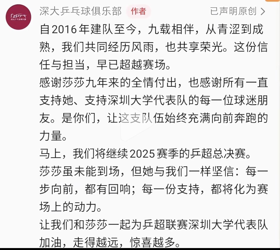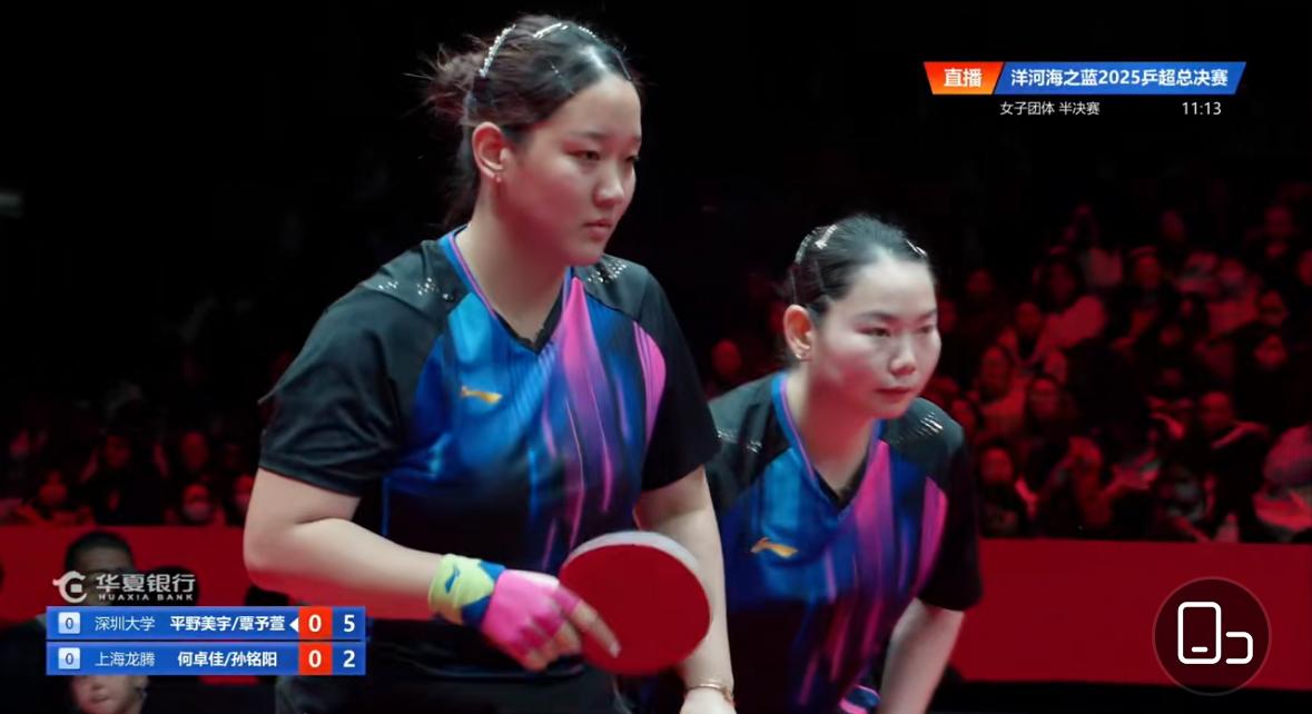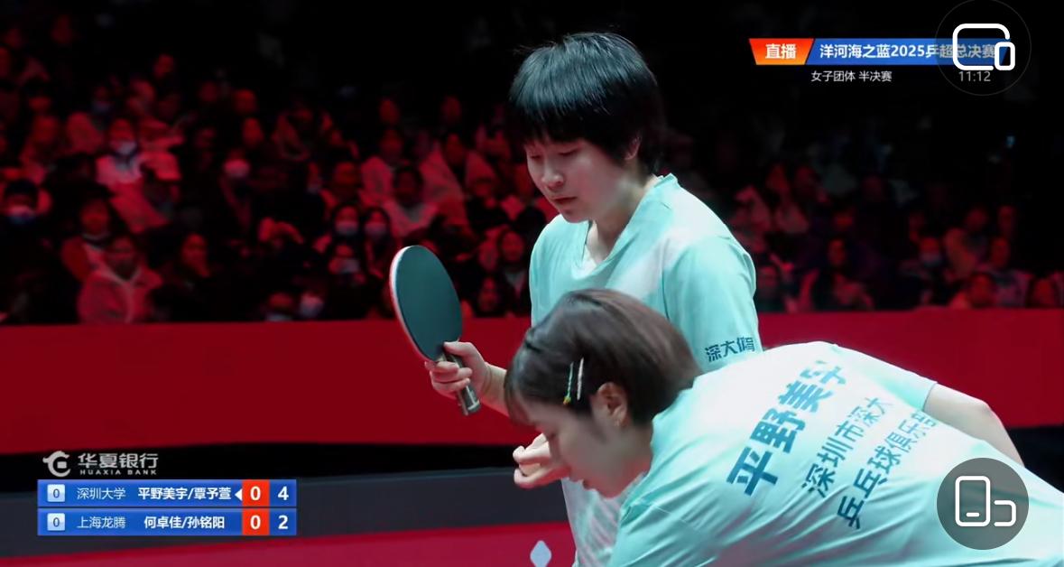 乒超总决赛深圳大学与上海龙腾的对阵表 蒯曼VS刘炜珊 孙颖莎正在康复中! 12月26日,乒超总决赛女团半决赛 深圳大学VS上海龙腾 第一盘 覃予宣/平野美宇VS何卓佳/孙铭阳 第二盘 蒯曼VS刘炜珊 第三盘 覃予宣VS孙铭阳 第四盘 蒯曼VS何卓佳 第五盘 平野美宇VS刘炜珊 孙颖莎没能参加乒超总决赛, 正在康复中, 上海龙腾陈熠没有参赛, 太遗憾, 平野美宇打的积极主动, 深圳大学的实力更厚实一些! 加油深圳大学, 加油上海龙腾!