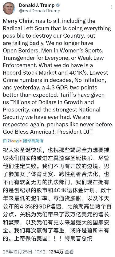 特朗普北京时间12月25日发文写道:“祝大家圣诞快乐,也祝那些竭尽全力想要摧毁我们国家的激进左翼渣滓圣诞快乐,尽管他们注定失败。我们不再有开放的边境,男子参加女子体育比赛,跨性别者合法化,也不再有软弱无力的执法部门。我们现在拥有的是创纪录的股市和401K退休金计划,数十年来最低的犯罪率,零通货膨胀,以及昨天公布的4.3%的GDP增速,比预期高出两个百分点。关税为我们带来了数万亿美元的增长和繁荣,以及我们有史以来最强大的国家安全。我们再次赢得了尊重,或许是前所未有的。上帝保佑美国!!!”   推文开篇就充满火药味。特朗普在祝福大家圣诞快乐后,话锋一转,将矛头指向"那些竭尽全力想要摧毁我们国家的激进左翼渣滓"。   这种标签化的表述方式,将政治对手描绘成国家破坏者,强化了"我们vs他们"的对立叙事。特朗普断言这些对手"注定失败",这种自信满满的宣示,意在向支持者传递必胜信念。   在政策层面,特朗普列举了多项执政成果。他宣称"不再有开放的边境",这指向其任内推行的强硬移民政策。   数据显示,自2025年1月以来,已有190万无合法身份的移民自愿离境,美国政府甚至将自愿离境补贴从1000美元提高到3000美元。这种以经济激励配合执法压力的做法,确实改变了美国的移民政策格局。   特朗普还提到"男子参加女子体育比赛"和"跨性别者合法化"的终结,这反映了其政府在文化议题上的保守转向。   这些表述呼应了特朗普任内推动的系列政策调整,包括废除"多元、平等、包容"项目,以及在教育、体育等领域强化传统价值观。   经济数据是特朗普推文的核心卖点。他声称股市和401K退休金计划创下历史新高,犯罪率降至数十年最低,实现零通货膨胀,GDP增速达4.3%且超出预期两个百分点。这些数据需要放在具体语境中理解。   2025年第二季度美国GDP环比增长确实达到3%,高于市场预期,但全年经济增长预期仍在2%左右。股市表现方面,标普500累计涨幅约3.27%,纳指涨幅约5.2%,道琼斯指数累计涨幅约28%,显示市场总体向好。   关于通胀,特朗普宣称"零通货膨胀"的说法需要审慎看待。2025年第二季度美国CPI同比涨幅稳定在2.7%,核心PCE物价指数为3.5%,虽然通胀压力有所缓解,但距离"零通胀"仍有差距。美联储预计2025年底核心PCE通胀率将达到2.5%,高于此前预测的2.2%。   关税政策是特朗普经济叙事的重要支柱。他声称关税带来了"数万亿美元的增长和繁荣"。数据显示,截至2025年7月底,关税收入累计达1420亿美元,占联邦财政总收入的3.1%,创1962年有数据以来的最高纪录。   但经济学家普遍认为,关税政策推高了进口商品价格,增加了消费者负担。高盛预测,到2025年底,核心PCE通胀率(剔除关税影响)有望降至2.1%,但加上关税影响后,通胀率将被提升至2.4%。   特朗普还强调"前所未有的强大国家安全",这与其任内推行的军事战略调整相呼应。2025年12月4日,特朗普政府发布《2025年国家安全战略报告》,将中国称为"唯一步步紧逼的威胁",并计划从欧洲抽身转向亚太。   但关税政策对国防工业供应链造成干扰,彼得森国际经济研究所专家警告,这种豪赌可能导致经济放缓、通胀走高,而受损的制造业和农业恰恰是国防工业的基础。   推文结尾的"上帝保佑美国",呼应了特朗普任内推动的宗教保守主义议程。他通过强化基督教民族主义叙事,巩固保守派基本盘,同时将意识形态斗争延伸到教育、文化等领域。   特朗普的圣诞推文本质上是其政治传播策略的延续。通过将节日祝福与政策宣传捆绑,他试图在传统节日氛围中强化政治叙事,巩固支持者基础。这种将节日政治化的做法,在某种程度上反映了美国政治极化的加剧,以及特朗普个人风格对公共话语的深刻影响。   值得注意的是,特朗普在推文中使用的数据表述存在选择性呈现的问题。虽然部分经济指标确实向好,但失业率、通胀压力、财政赤字等挑战依然存在。这种选择性叙事,既服务于其政治目标,也体现了其与主流媒体、经济专家之间的认知鸿沟。   从更宏观的角度看,特朗普的圣诞推文反映了美国政治生态的深刻变化。政治话语的对抗性增强,政策辩论的理性空间收窄,以及个人风格对制度规范的冲击,都成为观察美国政治的重要维度。无论是对支持者还是反对者而言,特朗普的推文都提供了一个窗口,让我们看到美国政治正在经历的重塑过程。