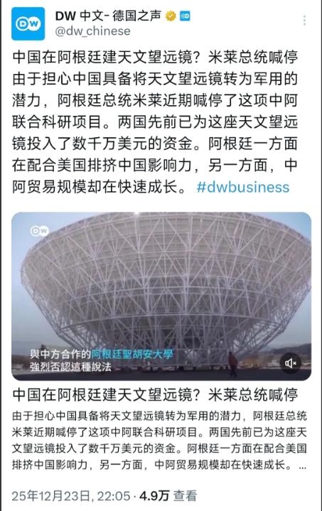 看来阿根廷的经济是缓了一口气,让米莱觉得我又行了。据报道,阿根廷总统米莱为讨好美国,以中阿合作的联合科研项目有转为军用的潜力,叫停了这座天文望远镜的建议,导致数千万美元的投入打水漂。 米莱这波操作真是把“翻脸比翻书快”演绎得淋漓尽致。 刚上台时,阿根廷经济烂到骨子里,外汇储备见底,比索贬得一文不值,全靠中国350亿人民币的货币互换协议续命,这笔钱不仅帮他稳住了汇率,还能用来偿还IMF的债务,那时候的米莱哪怕心里再反华,也得捏着鼻子说中国是“有趣的商业伙伴”。 现在经济刚缓过一口气,他就迫不及待讨好美国,叫停中阿合作的CART射电望远镜项目,让数千万美元投入打水漂,还撕毁枭龙战机订单、搁置锂矿开发合作,一副“我又行了”的嚣张模样。 但米莱显然打错了算盘,中国从来不是任人拿捏的烂好人,对付这种反复无常的主儿,手里的硬牌多的是,该亮的时候就得亮出来,让他知道反华是要付出代价的。 阿根廷的经济看着好转,其实根基比纸还薄,而中国恰恰攥着他们好几根经济命脉。 先说说货币互换这张王牌,阿根廷是第一个和中国签货币互换协议的拉美国家,从2009年到现在续了好几次,2025年刚把350亿人民币的额度续到2026年6月。 这笔钱对阿根廷有多重要?美联社都直言,这是阿根廷财政的核心,能帮他们支撑外汇储备、支付进口费用,在硬通货短缺的时候,简直就是救命钱。 米莱现在敢跟中国叫板,中方完全可以收紧这根“钱袋子”,要么缩减激活的额度,要么到期后不再续期,到时候阿根廷外汇储备又得见底,比索汇率大概率要再次崩盘,他所谓的“经济好转”瞬间就得打回原形。 再看看农产品贸易,阿根廷是农业出口国,而中国是他们大豆的关键买家。 2025年11月的数据显示,中国单月进口阿根廷大豆178万吨,同比暴涨了六倍,占当月进口总量的近22%,要是算全年,中国长期占阿根廷大豆出口总量的60%以上。 这些大豆可不是简单的商品,背后是阿根廷无数农民的生计,是他们重要的外汇来源。 米莱现在这么折腾,中方完全可以调整采购结构,把更多订单转给巴西——毕竟11月中国从巴西进口了585万吨大豆,占比72%——只要稍微倾斜一下,阿根廷的大豆就会积压,农民收入骤减,国内农业产业链得跟着遭殃。 到时候不用中国施压,阿根廷农民自己就会给米莱施压,让他掂量掂量反华的代价。 更关键的是,美国的援助根本靠不住。米莱为了抱美国大腿,放弃金砖、叫停中阿合作,可美国承诺的200亿援助说搁置就搁置,还把阿根廷纳入对等关税清单加征10%关税。 真要是中国收紧经济合作,美国就算想救也救不过来,毕竟中国的市场和资金是实打实的,而美国的承诺向来都是画饼。 暂停重大合作,让他的发展计划成空谈 米莱以为叫停一个天文望远镜项目就能讨好美国,却忘了中阿之间的重大合作远不止这一个,这些项目都是阿根廷发展的“刚需”,中国想停就能停。 先说说他亲手搞黄的CART射电望远镜项目,这可是拉美最大的单口径射电望远镜,本来能和中国天眼、智利阿塔卡马阵列联动,帮阿根廷在天文领域站稳脚跟,结果米莱以“有军用潜力”为借口,让海关扣押核心部件,项目彻底停摆,数千万美元投资打了水漂,阿根廷科研界怨声载道,不少天文学家公开抱怨政府短视,毁了国家的科技前途。 这还只是开始,中企原本计划投资50亿美元开发阿根廷的锂矿,要知道阿根廷锂矿储量占全球23%,这个项目投产后每年能给阿根廷带来12亿美元的出口收入,还能带动新能源产业发展,创造大量就业岗位。 结果米莱为了讨好美国,直接搁置了这个项目,硬生生把送到嘴边的肥肉丢了。 中方完全可以顺势彻底撤出这个项目,不仅不再投资,还可以召回技术团队,让阿根廷的锂矿只能躺在地下,看着邻国靠锂矿赚钱。 要知道,中国在新能源领域的技术和资金是阿根廷短期内找不到替代的,没有中国的支持,他们的锂矿开发就是空谈。 还有之前的枭龙战机订单,本来中国都愿意提供优惠融资和技术转让,结果米莱转头买了美国的二手F-16,还拿了美国4000万美元的“补贴”。 这笔买卖看着划算,实则亏大了——二手战机维护成本高,关键技术还被美国卡着,而枭龙的性价比和后续服务根本不是二手F-16能比的。 中方现在完全可以暂停所有军贸相关的合作探讨,让阿根廷知道,想靠得罪中国来换美国的“残羹剩饭”,最后只会落得个“两边不靠”的下场。 这些重大合作项目,每一个都关系到阿根廷的长远发展,中国暂停合作,就等于卡住了他们的发展节奏,让米莱的“强国梦”变成泡影。