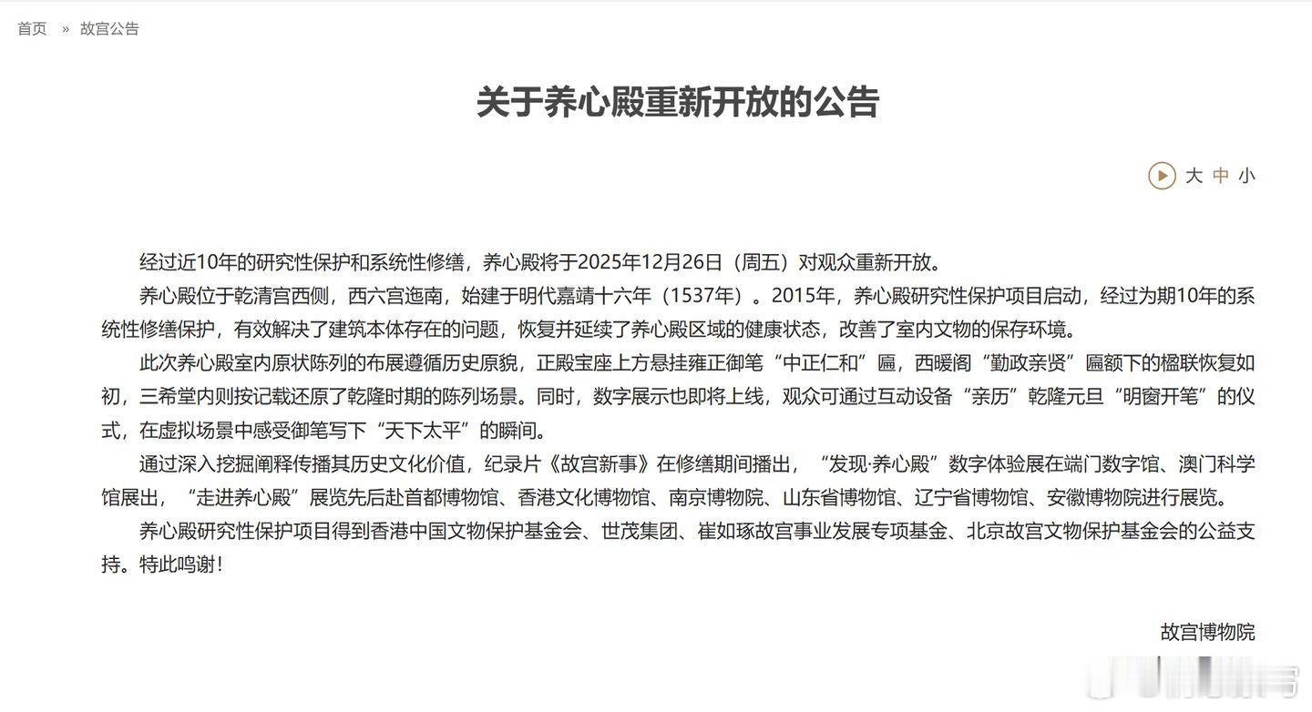 重新开放的养心殿有哪些新看点北京故宫养心殿|历经10年修缮重新开放。跨越125年的时光对望,故宫养心殿终在2025年12月26日重启朱门。从1900年遵义门的旧影,到如今修缮后重现的“中正仁和”匾、复原的三希堂,十年匠心修缮,让这座见证了清代八帝执政起居的宫殿,以岁月如新的模样重回视野。红墙黄瓦间,是历史的回响,也是文物保护的新生。故宫修缮 历史建筑 故宫 养心殿 养心殿十年修缮