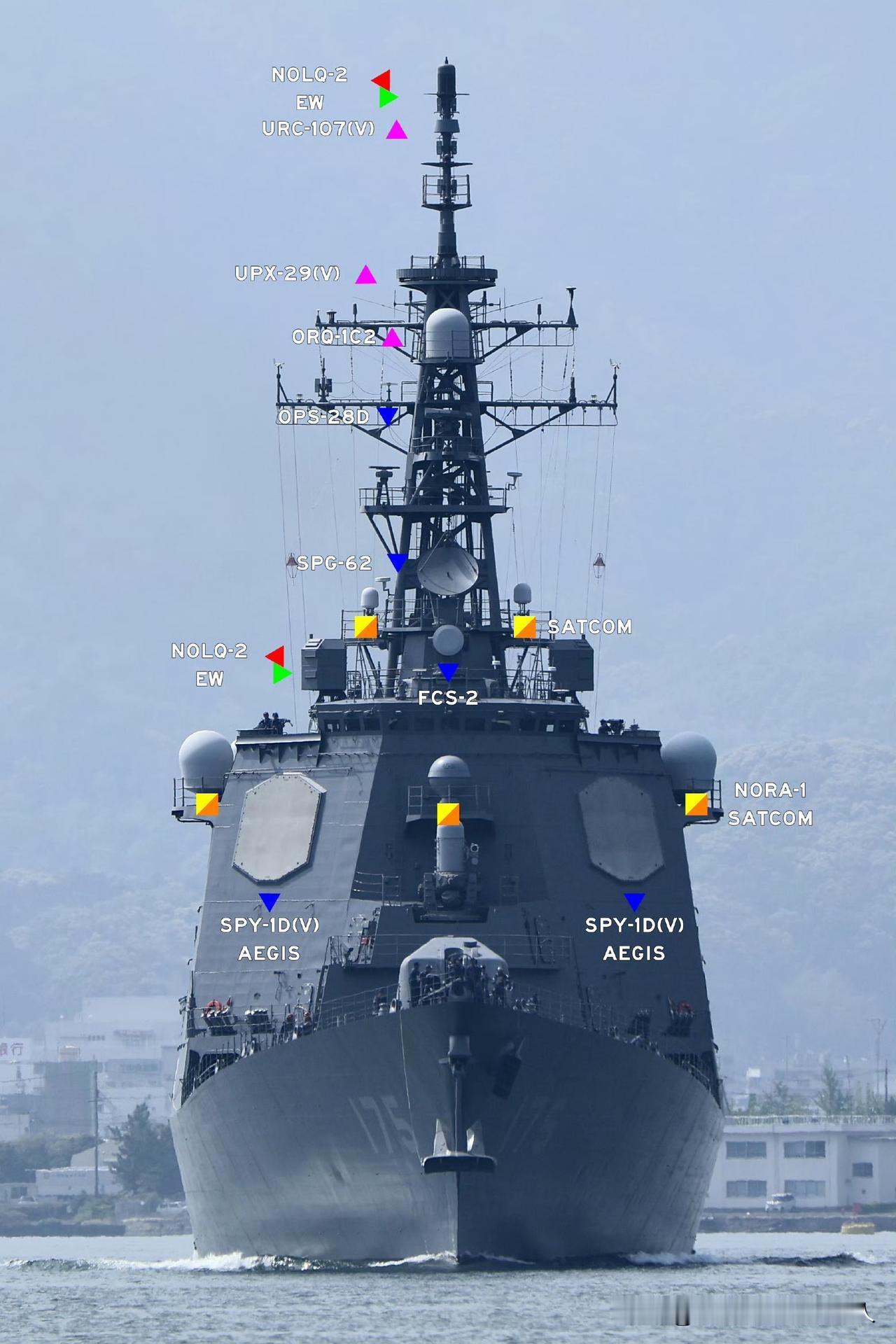 一样的供应商,不一样的布局 费兹杰罗号导弹驱逐舰(DDG-62),为阿利·伯克级导弹驱逐舰,于1995年10月服役。 妙高号导弹驱逐舰‌(DDG-175),属于‌金刚级驱逐舰‌的第三艘,在1996年3月14日正式服役‌。‌ 两舰差不多是同一时代的产物,电子设备与各型雷达乃至于宙斯盾系统都来自于同一供应商的。 ❇️雷达系统方面,两者均采用AN/SPY-1D相控阵雷达,但金刚级的天线安装位置更高,对掠海目标探测距离略优。此外,金刚级因舰体更大,电子设备容量和指挥空间也更充裕。 ✳️宙斯盾作战系统方面,阿利伯克I级采用美国海军Baseline 4系统,而金刚级使用定制版Baseline J(J1/J2),后者增强了反导能力并纳入Link-16数据链,但移除了对地攻击功能。 ✅电子战系统上,阿利伯克I级使用美制SLQ-32(V)3,专注于电子支援与对抗;金刚级则配备日本国产NOLQ-2系统,功能更全面,涵盖电子侦察、干扰和诱饵发射。 阿利伯克级