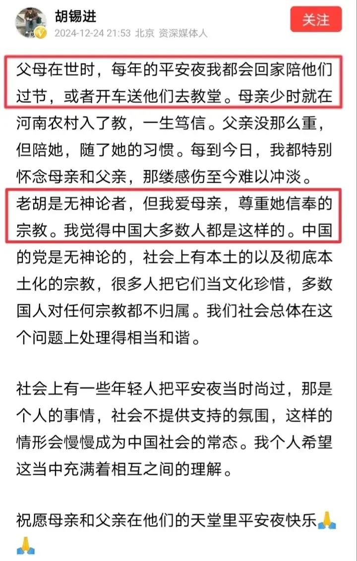 这几天胡锡进一反常态不再发文纪念平安夜,也不敢发文非议毛主席,这是怎么回事呢? 原来往年每逢12月24日或者12月25日,胡锡进都要以纪念父母的名义,发文推崇平安夜和剩蛋日。同时往年每逢12月26日,胡锡进还要对毛主席评头论足,数落一下所谓“晚年的一些错误”。谁知今年胡锡进偃旗息鼓,既没有公开纪念平安夜和剩蛋日,也没有公开抨击伟人“晚年的一些错误”。 要知道,老公知胡锡进一向亲美崇日,一方面鼓吹美国是人间天堂,“我希望自己能够出生在美国”;一方面鼓吹日本的发达社会,“老胡希望中日永不再战”。 可是近期发生了一连串事件屡次戳穿了胡锡进的谎言,比如自媒体热议的美国中产斩杀线,让胡锡进向往的“美国梦”化为泡影。又如日本的挑衅言论与磨刀霍霍,让胡锡进鼓噪的“中日永不再战”沦为笑柄。 由于胡锡进精心编织的美日迷梦被民众道破,如果老胡还敢以纪念平安夜和剩蛋日为名美化西方社会,恐怕会遭到觉醒民众的一顿嘲笑。如果老胡还敢对毛主席说三道四,只怕会受到觉醒民众的猛烈反击。 此情此景,让胡锡进今年的平安夜不再太平,让胡锡进今年的剩蛋日不再快乐,老胡茕茕孑立、形影相吊,这又何必呢?