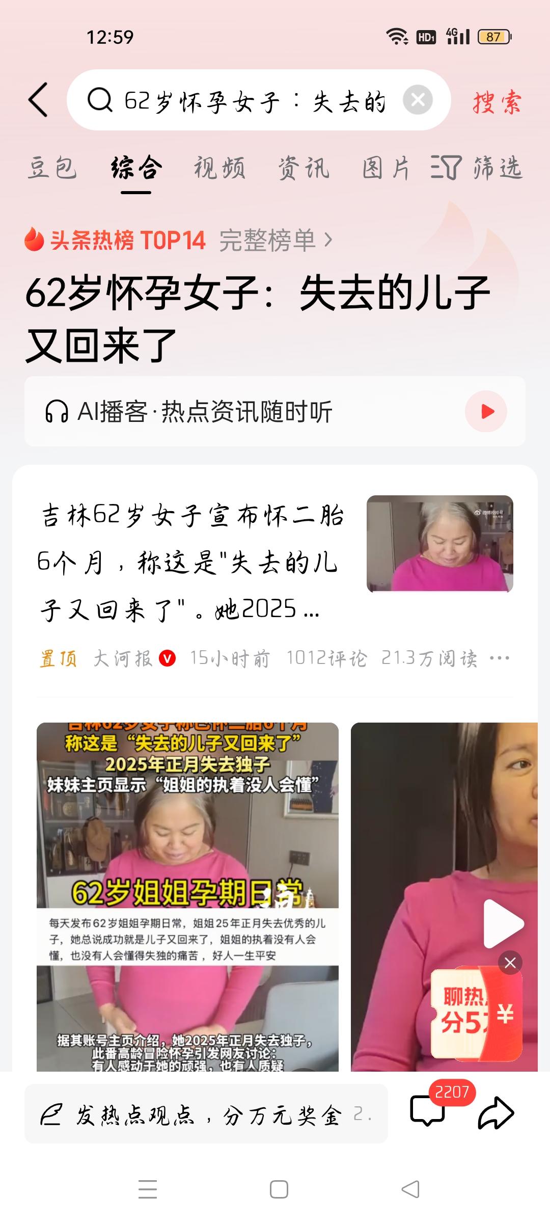 失去的儿子又回来了,我想说 据大河报报道,吉林62岁女子宣布怀二胎6个月,称这是“失去的儿子又回来了",她2025年1月失去独子,关于这一事网上议论纷纷,我想说,这位女子大龄怀孕是不得已而为之,她的妹妹理解她,称“姐姐的执着没人能懂“,不少人是从得失来衡量这件事,个人认为,该女子还想传承血脉,有了孩子,对她来说是一种寄托,一种安慰,她怀二胎,肯定不是冲动,而是深思熟虑。各位条友觉得呢?