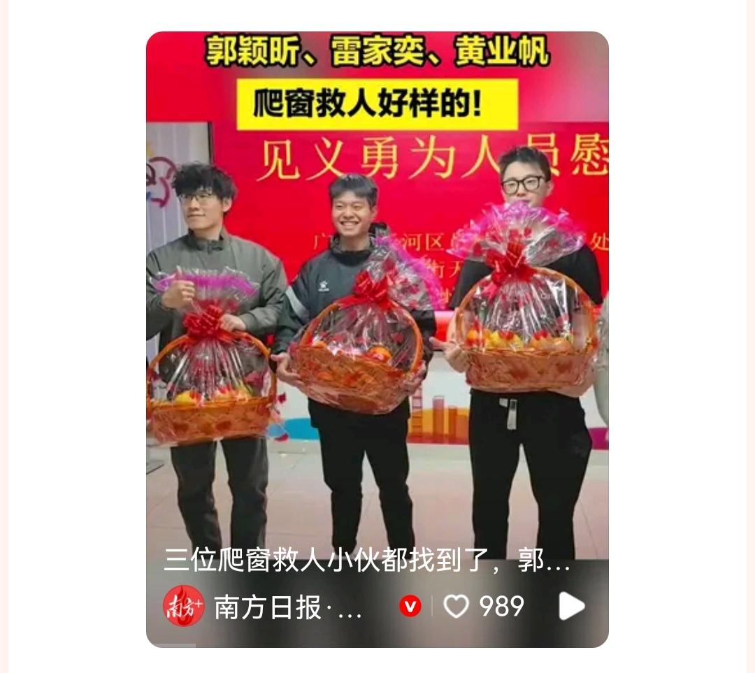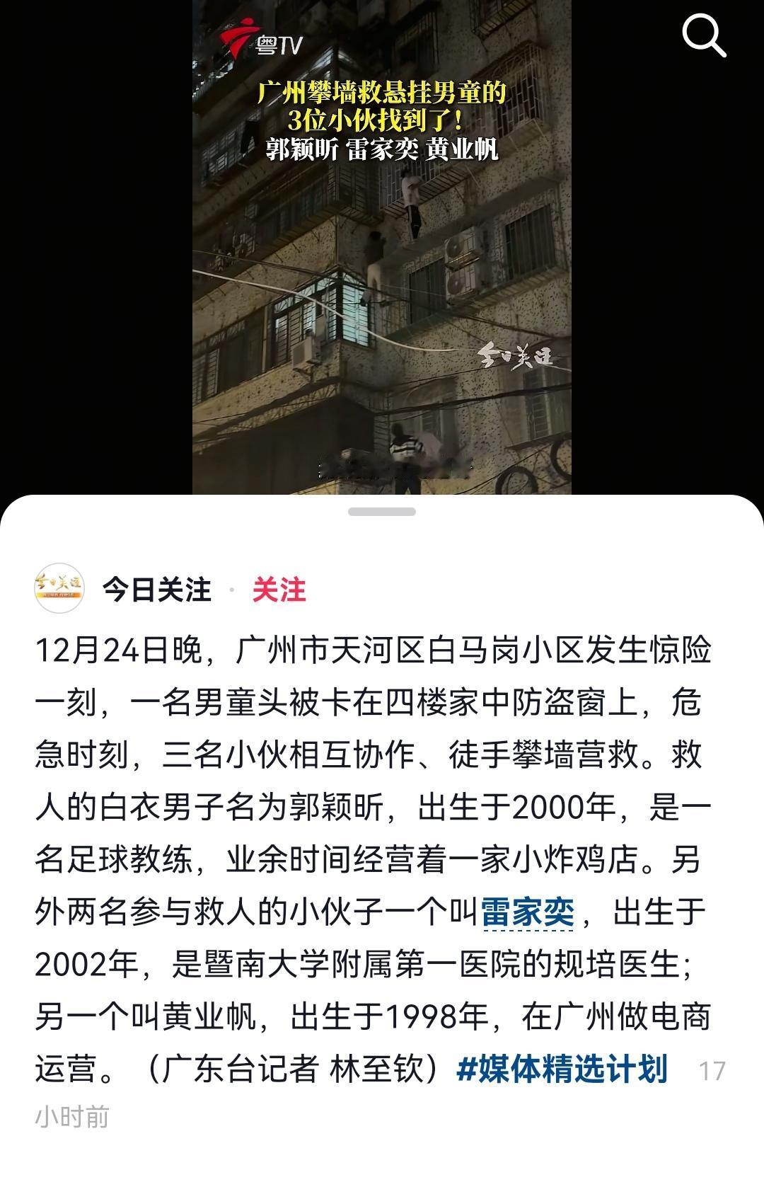 文化再高,高不过善良,才华再好,好不过品德!12月24日的广州夜晚,天河区白马岗小区的一声哭喊,揪紧了所有人的心,一名3岁男童头卡四楼防盗窗,身体悬空在外,随时可能坠落。就在这瞬间,三个素不相识的小伙挺身而出,足球教练郭颖昕徒手攀墙当托举者,规培医生雷家奕抱棉被做接应人,电商运营黄业帆紧随其后搭把手,十分钟就把孩子从死神手里抢了回来。这不是电影里的超级英雄情节,而是普通年轻人用本能的善良,写下的最动人的城市故事。 事后社区为三人申报“见义勇为”称号的举动,也值得点赞。表彰凡人善举,不仅是对三位小伙的肯定,更是在为社会传递一种信号,善良和勇敢不会被辜负,挺身而出的人,会被这个世界温柔以待。当越来越多的人愿意为陌生人的安危驻足、伸手,我们的城市才会真正变成一个有温度的共同体。
