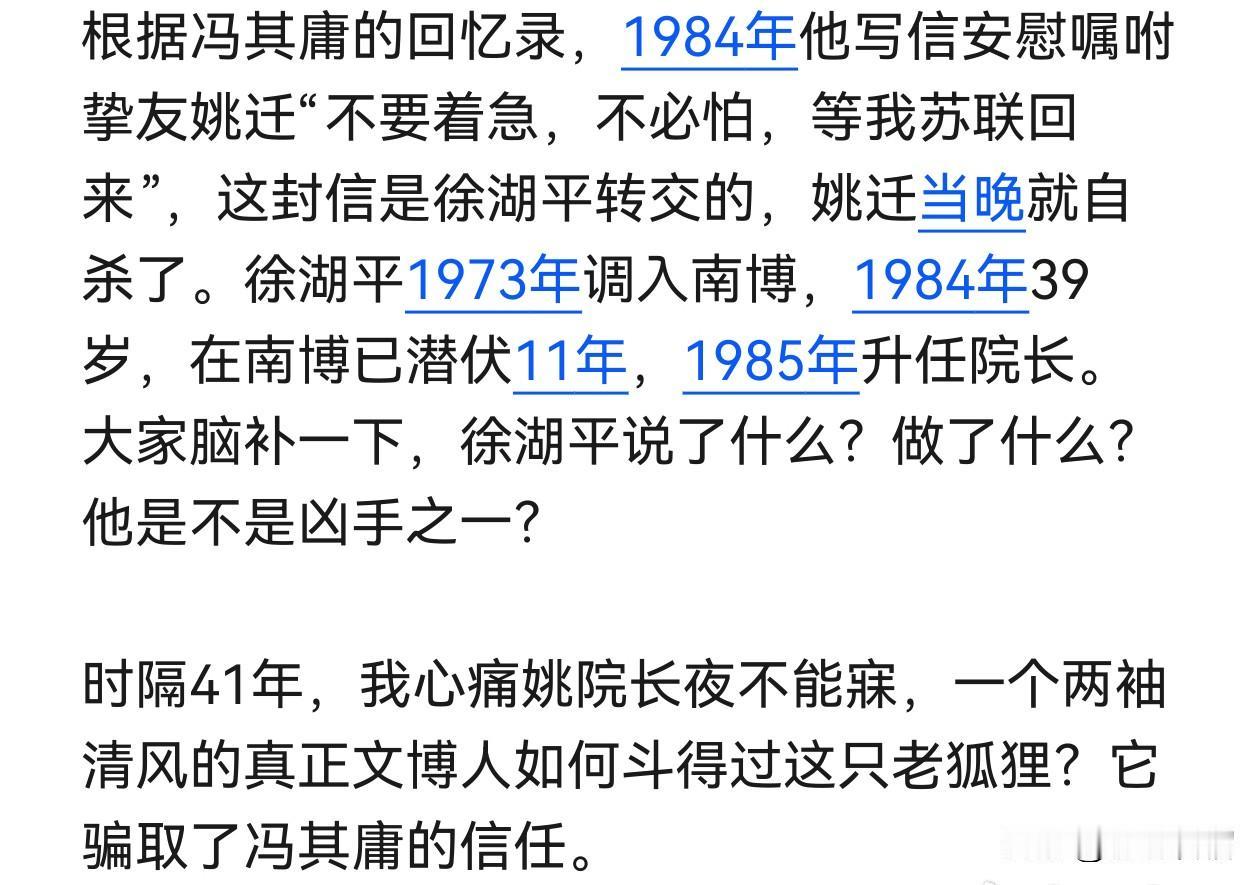 姚迁院长自缢身亡事件背后的相关细节,着实令人细思极恐! 据姚迁院长的好友冯其慵的回忆录记载,1984年,姚迁院长被诬陷以权谋私、侵占他人学术成果。当时冯其慵人在苏联,写信安慰并叮嘱这位挚友:“不要着急,不必害怕,等我从苏联回国。”而这封信由姚院长的同事徐湖平转交,结果姚迁院长当晚便自缢身亡了。 徐湖平于1973年调入南博,1985年升任院长。当晚,徐湖平是否把信转交给了姚院长,又说了些什么,这与姚迁院长的自缢事件是否存在直接关联?诸多问题都有待我们深入调查。 大家认为姚迁院长自缢与徐湖平是否有直接关系呢? 欢迎评论区交流
