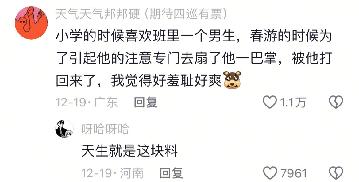 小学的时候喜欢班里一个男生,春游的时候为了引起他的注意专门去扇了他一巴掌,被他打回来了,我觉得好羞耻好爽