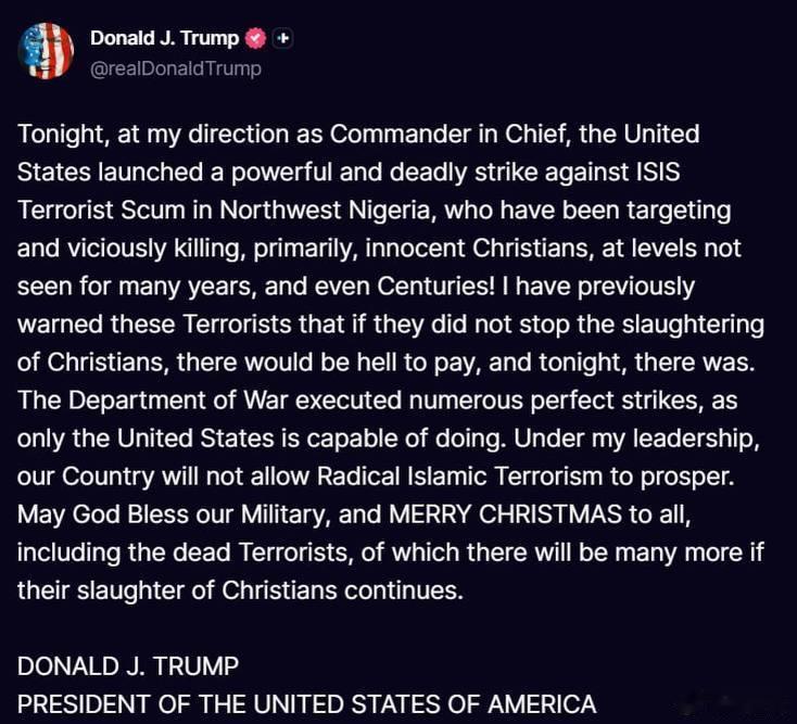 「這幾天令我真的很痛 心的事情是,俄羅斯顯然拒絕在聖誕停火的提議。」不知道良十四世教宗會不會對川普也痛心...痛心二人組!!「今晚,在我作為三軍統帥的指示下,美國對尼日利亞西北部的『伊斯蘭國』(ISIS)恐怖分子發動了一次強有力的致命打擊。這些恐怖分子長期以來一直以無辜基督徒為目標,殘忍地殺害他們,其規模之大,多年來甚至幾個世紀以來都未曾見過!我先前曾警告過這些恐怖分子,如果他們不停止屠殺基督徒,必將付出慘痛的代價。今晚,他們的警告得到了執行。美國戰爭部執行了多次精準打擊,只有美國才能做到。在我的領導下,我國絕不允許極端伊斯蘭恐怖主義得逞。願上帝保佑我們的軍隊,祝所有人聖誕快樂,也祝福那些死去的恐怖分子聖誕快樂。如果他們繼續屠殺基督徒,死者還會更多。」前二天許多媒體以拒絕聖誕節停火為由,指責俄羅斯總統普丁。不知道他們對聖誕節開火的川普是不是也是同樣的標準?不,它們不敢,因為他們的美國是自由的燈塔,是自由的轟炸。這幾年看了這麼多噁心的雙標,即使是教宗也嚇不倒我了。