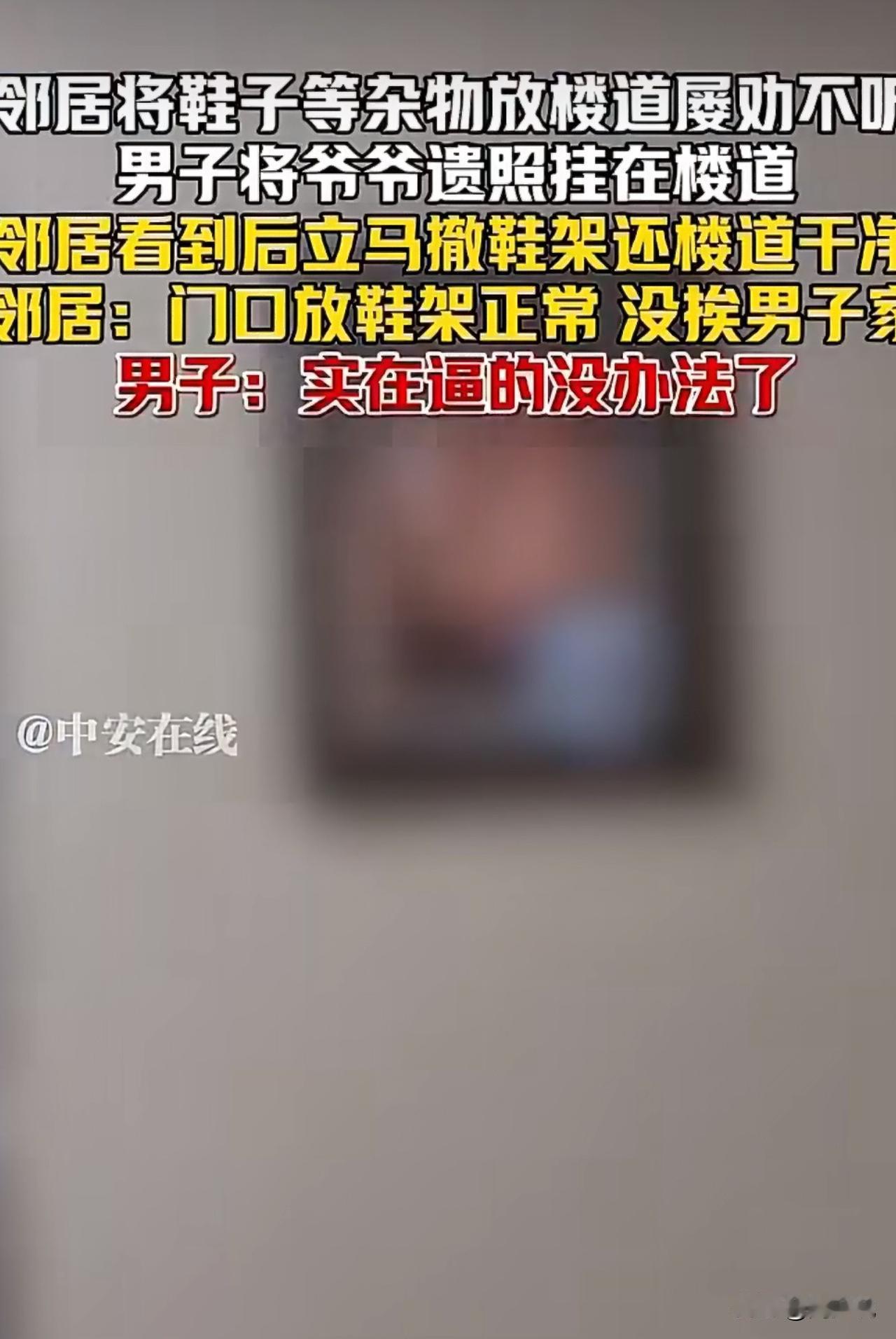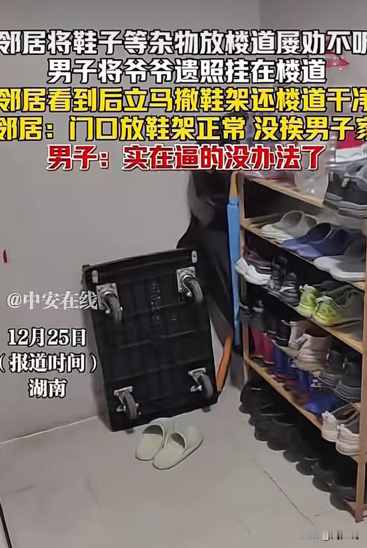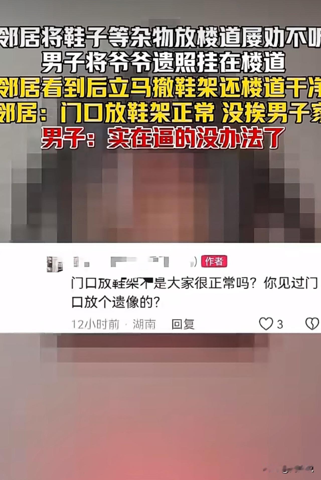 “这一招确实狠!”湖南一小区,因为几个鞋架,两家人闹到差点“撕破脸”。男子忍无可忍,使出一招“杀手锏”,直接把邻居治得服服帖帖,网友却吵翻了:有人说干得漂亮,有人说太吓人,到底谁过分? 事情发生在湖南某小区。男子发现,自家门口的楼道里,邻居经常把鞋架、纸箱等杂物堆得到处都是,既挡路又不卫生。多次沟通,对方一句“门口放鞋架很正常,又没挨你家门”,把他顶了回去。 眼看提醒无效,男子终于急了。他想到一个“狠招”:把已故爷爷的遗照,端正地挂在楼道墙上,正对着邻居的鞋架。 结果立竿见影,邻居看到遗照后,二话不说,当天就把鞋架和杂物全部撤走,楼道瞬间恢复整洁。男子坦言:实在是被逼得没办法了,才出此下策。 这一幕被发到网上后,评论区直接炸锅。有网友说:“这操作太硬核了,但也能理解,楼道本来就是公共区域,乱放东西确实不合适。” 也有人认为:“用遗照吓邻居,有点过了,虽然解气,但做法不太尊重逝者。” 还有人调侃:“有些邻居就是不见真格不回头,这招虽然极端,但有效。” 从教育角度看,周少认为这件事折射出两个现实问题:一是公共空间意识的缺失,很多人习惯性把“家门口”当成“自家地盘”,忽视了对他人的影响。 二是沟通方式的困境,当正常提醒无效时,有人选择极端手段,这其实是社会文明程度的一面镜子。 其实,真正成熟的邻里关系,不应该靠“吓”出来,而要靠规则和自觉。楼道不是私人仓库,更不是“谁先占谁有理”的灰色地带。 与其事后“硬核反击”,不如事前立好规矩、讲清边界,让“不占楼道、不乱堆物”成为大家默认的文明底线。#寻美三湘# #长沙新朋友#