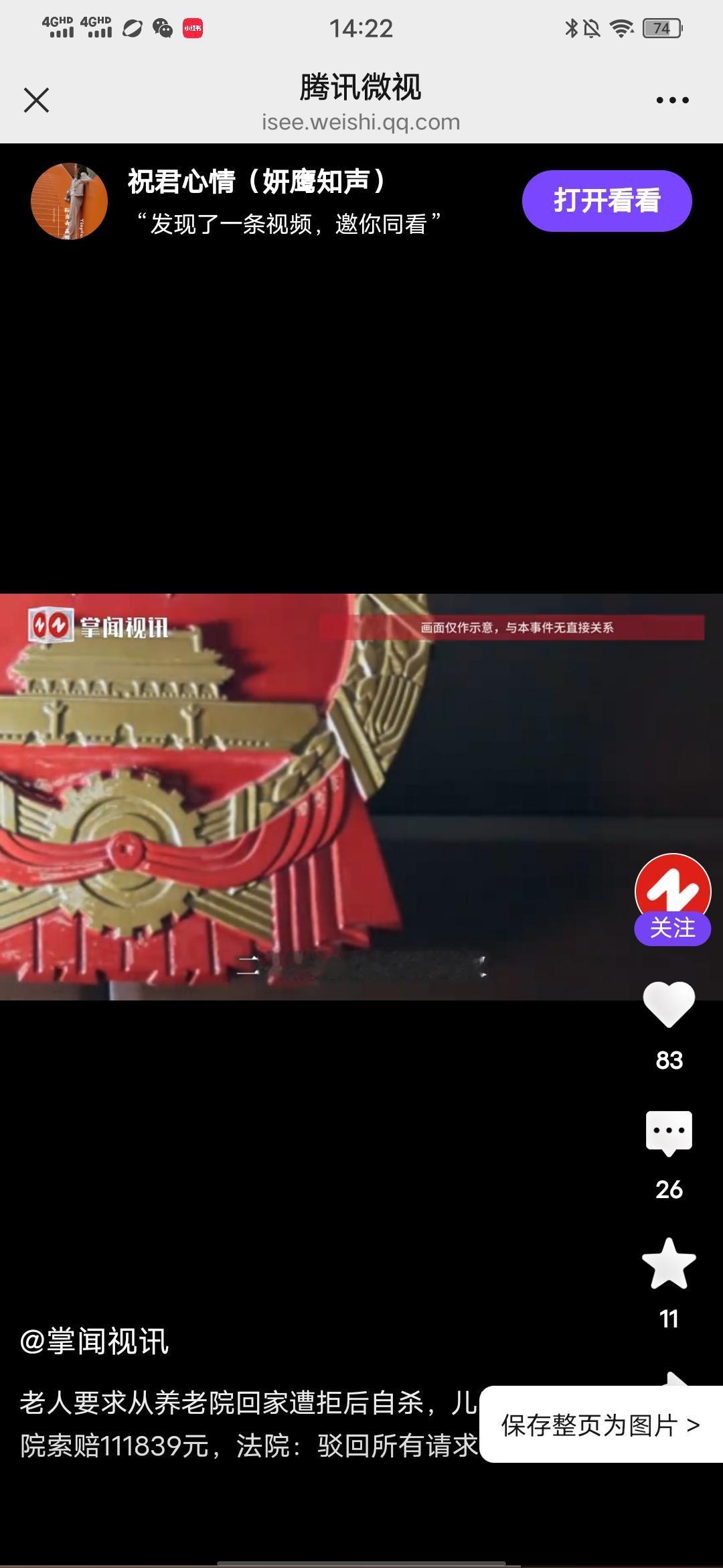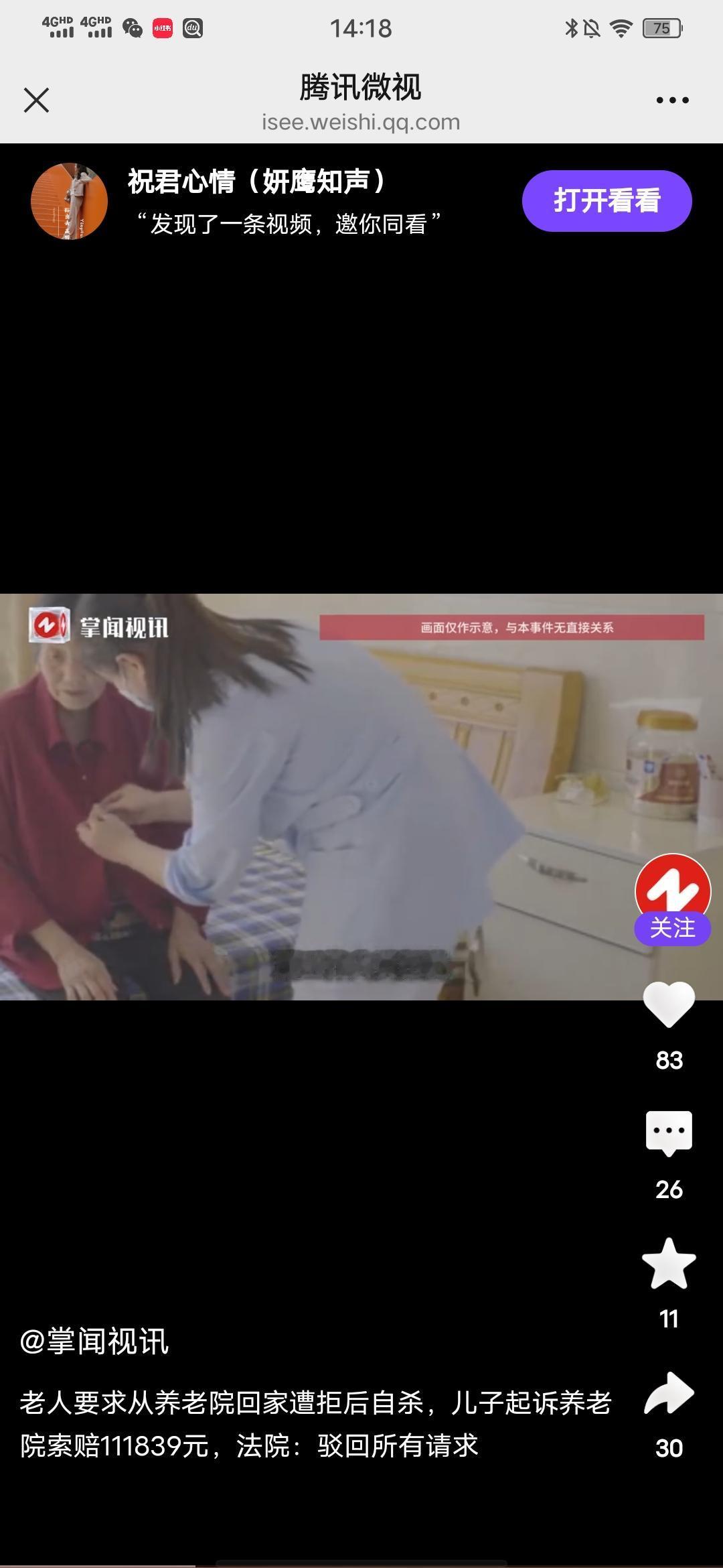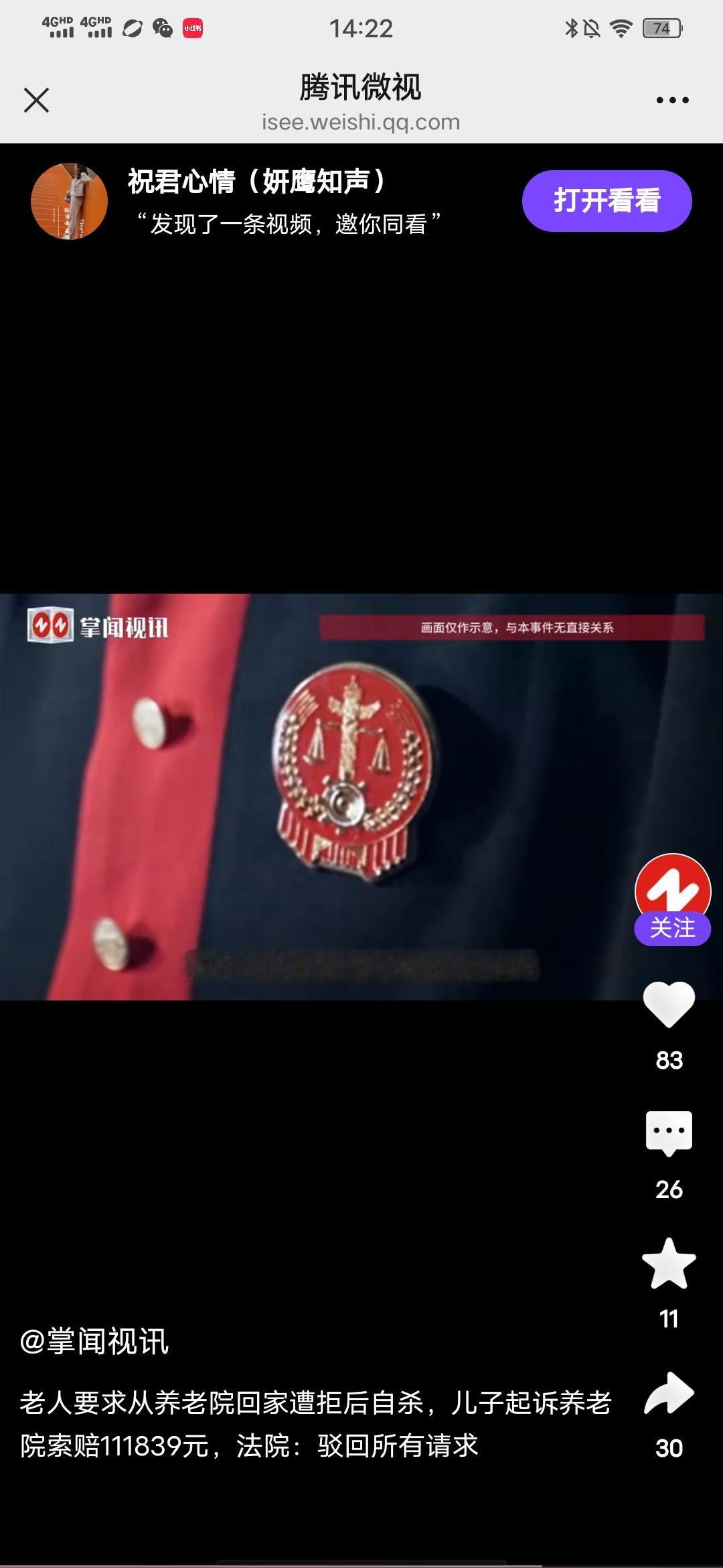 老人要求从养老院回家遭拒后自杀,儿子起诉养老院索赔111839元,法院:驳回所有请求! 掌闻视讯发出的来自热度新闻的报道,四川大邑县的袁老先生,2023年12月入住养老院,并签订了养老机构服务合同,以及健康状况自我陈述书,确认袁先生没有自杀自伤倾向。 时间到了2024年8月8日,养老院组织老人在大厅就餐看电视, 袁先生的妻子称,袁先生要求换奥运台,被工作人员拒绝,8月11日,袁老先生独自离开养老院去到自己儿子的住处,他打电话给儿子说想在家中离世,但是儿子不给开门,持续敲门都被拒绝后,他就报了警,当天10点半,袁老先生就跳楼身亡了。 后面袁老先生的儿子和妻子就把责任赖在养老院头上,以养老院不给换台,受精神侮辱为理由,将养老院给起诉了。养老院拿出当天大厅监控视频显示,当时袁老先生是背对着电视吃饭的,实际要求换台的是他的妻子罗某。 后来还有证据显示,袁老先生之前因为家庭财产纠纷,将房子赠给他二爷爷家的孩子,他们父子关系因此破裂,还签了断绝父子关系协议,而袁老先生去住养老院,也是被他儿子赶出来没有住处,所以才去的养老院。所以,综合证据下来,法院给了公正判决,驳回了袁老先生儿子和妻子的全部诉求。 其实,让人无法理解的是,为什么袁老先生要把房子给别人而不给自己的儿子呢?即使儿子再不成器,做父母的都会把自己的所有东西都留给自己的孩子啊。既然把房子给别人了,那么你想要在家中离世,也该去找你送房子的人,不是已经跟儿子签了断绝关系协议吗?既然最后还是凡事要找自己的孩子,为什么当初要狠心什么都不给自己的儿子呢? 而其实这个当儿子的,虽然因为父亲的做法让你寒心了,但是你应该明白原因啊,就算不理解,就算恨,但是毕竟生了你,养了你,你可以不再认他,但就算是陌生人,你也应该听听他的诉求,或者帮他找到解脱之法啊,切不了太冷漠太狠心啊。不过,明明是自己家的问题,非要把责任推到无辜之人头上,企图讹上一把,捞上一笔也是不道德的行为。 唉,家家有本难念的经,有任何事,终归是要在自己家人间来解决,不要胳膊肘往外拐就不会有太大矛盾,类似家庭引以为戒吧!
