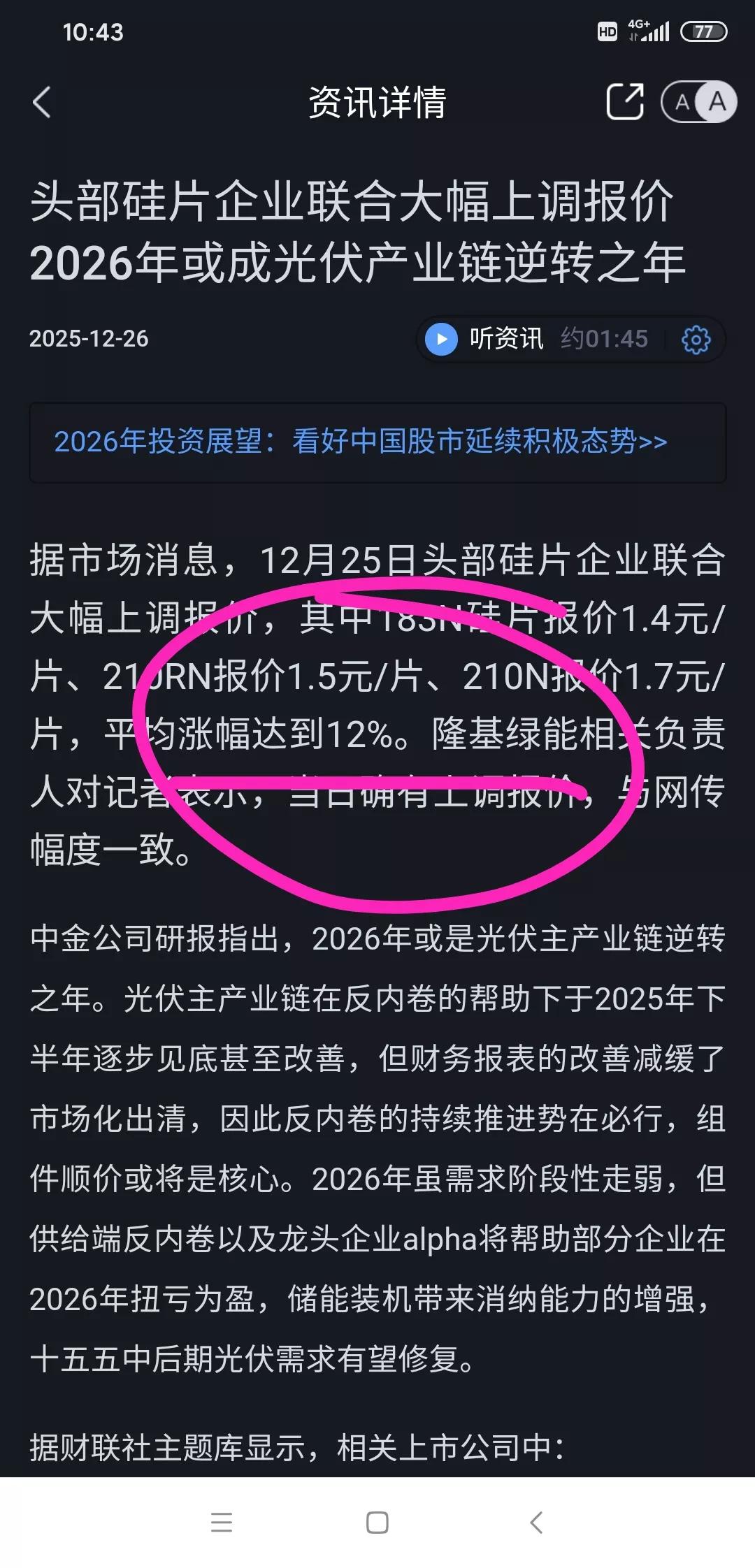 隆基绿能今天打鸡血了,直接跳空高开高走。真是令人刮目相看了。 据说这是因为硅价格大涨,这消息一出,隆基离扭亏为盈又近了一步,真是让人兴奋。 硅作为光伏产业的重要原材料,价格上涨对隆基这样的企业来说,无疑是个利好。这意味着他们的产品成本可能会降低,利润空间也会相应扩大。而且,随着光伏市场的不断发展,对硅的需求也在持续增加,这也为隆基的未来发展提供了更多的机遇。 上次从23调整下来,最低差到到17元,还没有个像样的反弹,希望这次能走出一波大反弹。 也希望隆基能抓住这次机会,实现扭亏为盈,业绩越来越好,让股价回到曾经的50元/股,为投资者带来更多的回报。 不知道回到50还有没有希望?