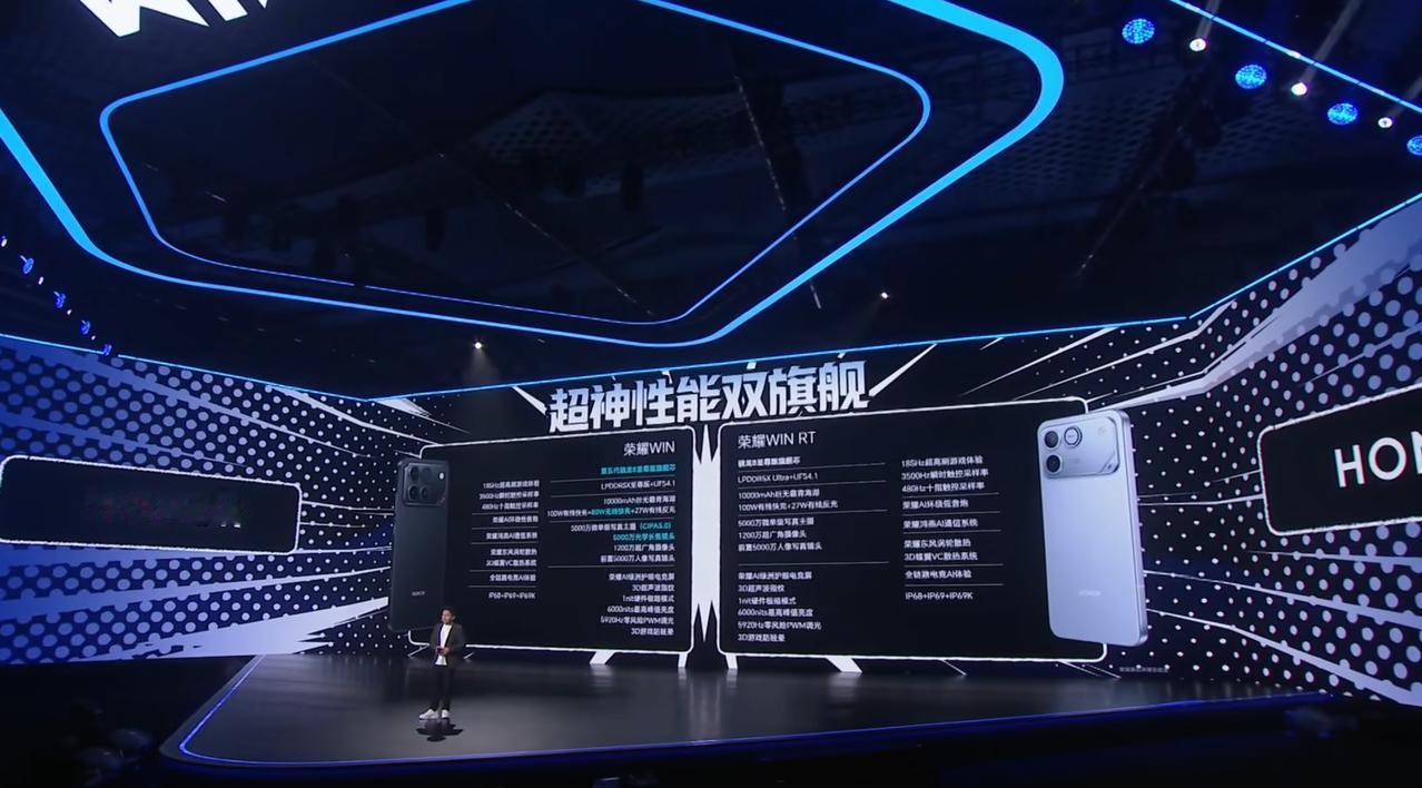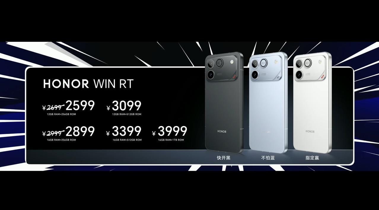荣耀 WIN RT 发布,12+256GB 售价 2599 元、16+256GB 售价 2899 元、12+512GB 售价 3099 元、16+512GB 售价 3399 元、16GB+1TB 售价 3999 元,价格怎么样? - 芯片:骁龙 8 Elite 芯片,LPDDR5X Ultra 内存,UFS 4.1 闪存,搭载荣耀幻影引擎 3.0,荣耀自研能效增强芯片 HONOR E2、自研射频增强芯片 HONOR C1+,抢网 Wi-Fi 电竞芯片,荣耀东风涡轮散热(每分钟 25000 转)+ 3D 蝶翼 VC; - 屏幕:6.83 英寸 2800×1272 天马 OLED 直屏,全局峰值亮度 2000nits,20% APL 局部亮度 4000nits,局部激发亮度 6000nit,最低亮度 1nit,支持 185Hz 刷新率(LTPS),480Hz 十指触控采样率,3500Hz 瞬时触控采样率,5920Hz 高频 PWM 调光,圆偏振光 2.0; - 相机:前置 50MP,后置 50MP 主摄(索尼 LYTIA 700,1/1.56",OIS,CIPA 5.0)+ 12MP 超广角双摄; - 续航:10000mAh 巨无霸青海湖电池(硅含量 15%,能量密度 910Wh/L),100W 快充(兼容 40W UFCS),27W 有线反向充电,支持充电分离; - 其他:厚 8.3mm,重 225g,快开黑、指定赢、不怕蓝 3 款配色,支持 IP68 & IP69 & IP69K 防尘防水,NFC,双 1216 扬声器,0809H X 轴线性马达,3D 超声波指纹识别,双频 GPS、四频北斗,MagicOS 10.0 系统,支持 PC 模拟器。