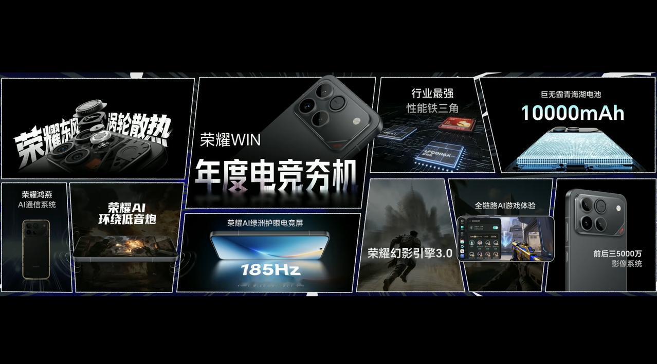 荣耀 WIN 发布,12+256GB 售价 3999 元、12+512GB 首销 4399 元、16+512GB 售价 4699 元、16GB+1TB 售价 5199 元。 - 芯片:骁龙 8 Elite Gen 5,LPDDR5X 至尊版(仅 16GB,10.7Gbps),UFS 4.1 闪存,搭载荣耀幻影引擎 3.0,荣耀自研能效增强芯片 HONOR E2、自研射频增强芯片 HONOR C1+,抢网 Wi-Fi 电竞芯片,荣耀东风涡轮散热(每分钟 25000 转)+ 3D 蝶翼 VC; - 屏幕:6.83 英寸 2800×1272 天马 OLED 直屏,全局峰值亮度 2000nits,20% APL 局部亮度 4000nits,局部激发亮度 6000nit,最低亮度 1nit,支持 185Hz 刷新率(LTPS),480Hz 十指触控采样率,3500Hz 瞬时触控采样率,5920Hz 高频 PWM 调光,圆偏振光 2.0; - 相机:前置 50MP,后置 50MP 主摄(索尼 LYTIA 700,1/1.56",OIS,CIPA 5.0)+ 12MP 超广角 + 50MP 直立长焦(3 倍,OIS)三摄; - 续航:10000mAh 巨无霸青海湖电池(硅含量 15%,能量密度 910Wh/L),100W 快充(兼容 40W UFCS),80W 无线快充,27W 有线反向充电,支持充电分离; - 其他:厚 8.3mm,重 229g,快开黑、指定赢、不怕蓝 3 款配色,支持 IP68 & IP69 & IP69K 防尘防水,NFC,双 1216 扬声器,0809H X 轴线性马达,3D 超声波指纹识别,双频 GPS、四频北斗,MagicOS 10.0 系统。