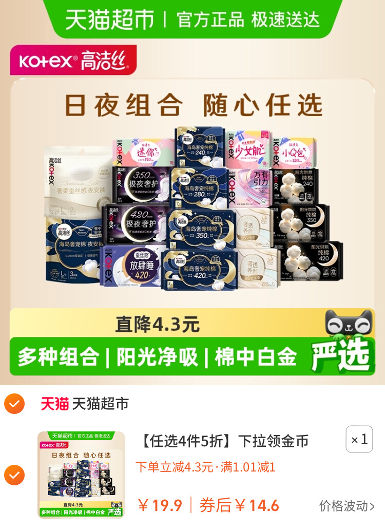 【任选4包🔥18.9】高洁丝卫生巾*4包下拉领金币,高洁丝+蔓越莓+