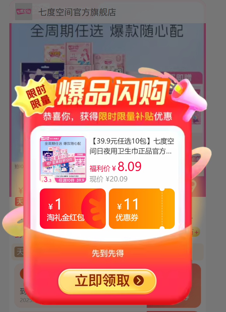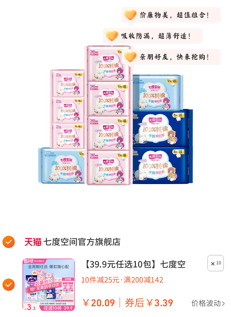【任选10包🔥到手8.09】七度空间卫生巾日夜用+速干+超薄设计!!