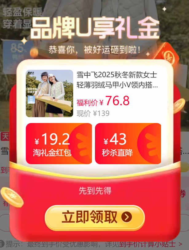 【🔥60左右】雪中飞轻薄羽绒马甲小V领采用100%锦纶面料,耐磨透气!!鸭绒填充,保暖效果好!