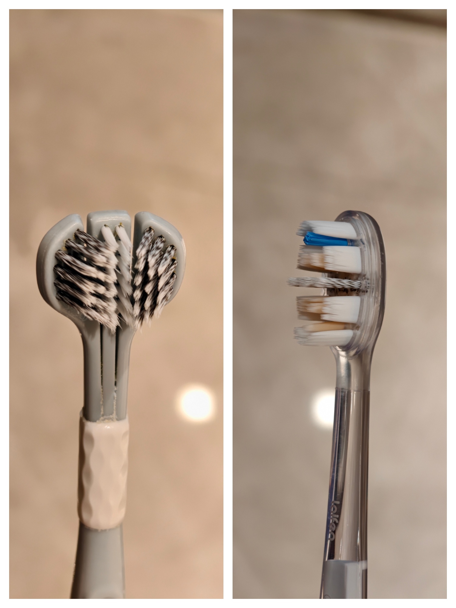 我是在2018年戴的牙套,那个时候牙还是挺乱的,存在中线不齐的情况。三年的时间里每个月调整完都能感受到拉扯,我还挺享受的,因为我知道每次都在变好。摘了牙套之后牙齿发黄是我最烦的,那个时候用美白牙膏、美白牙贴,还专门去做了美白牙齿的项目,但都只管一阵,今年去洗牙,意外做了一次抛光,效果意外的好,原来是我摘牙套时牙齿上面还有残胶,当初应该先去掉残胶会好很多,这么一想当初花了些冤枉钱那牙齿整好了、抛光了、美白了,好好刷牙维护好就OK了,徕芬的新款电动牙刷i2就是我最近的刷牙搭子,洗护品类里颜值NO.1有木有?透明的机身!无线充电!除了振动刷头还可以自己摆动!刷牙的情绪价值拉满如果刷头在软些、提供个像图三(左图)的这种刷头就更好了方圆说箍牙是最好的医美