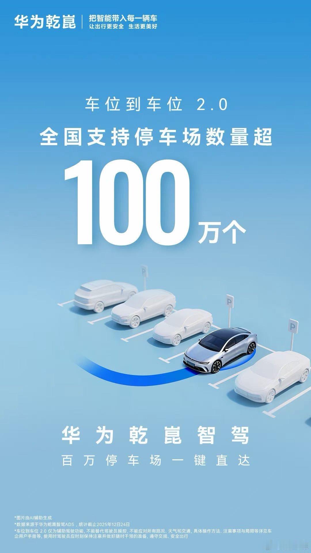 华为乾崑智驾的最新进展!“车位到车位2.0”商用一年多,全国支持的停车场数量到了100万个了,用户累计使用超过3000万次! 不管是商场地下车库还是小区地库,只要在支持的停车场里,点一下就能让车从下车位自动开到目的地车位,不用绕圈找位、不用手动搓方向盘,主打一个“全天候省心”!以前停车,找空位就得绕半小时,倒库还得小心翼翼,现在直接把“出行省心度”拉满了,难怪才一年多就被用了3000多万次——毕竟谁能拒绝“少费脑子少费力”的好事啊!不得不说华为乾崑是真把智驾的实用度踩在了用户痛点上,期待之后能支持更多的停车场,带来更加丝滑的体验!
