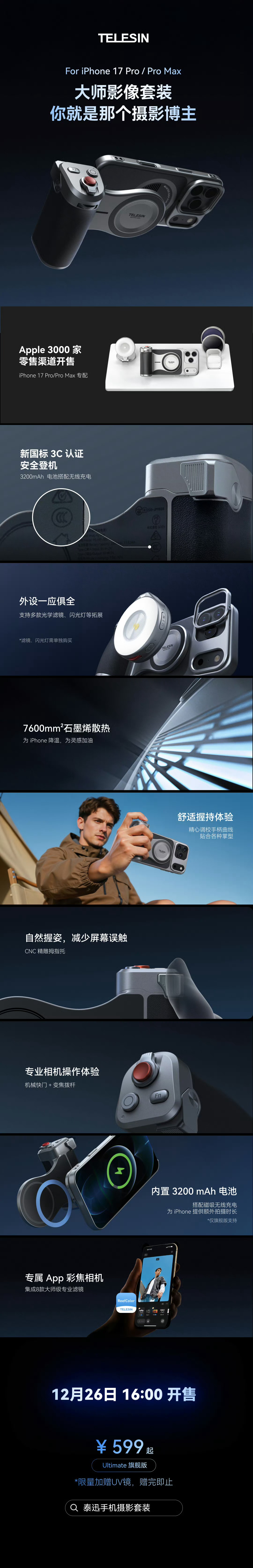 泰迅 iPhone17 Pro/Pro Max 大师影像套装,已进驻Apple零售。新3C认证,3200mAh电池,支持外挂闪光灯,实现全场景创作!📷苹果用户终于也有自己的大师影像套装了~
