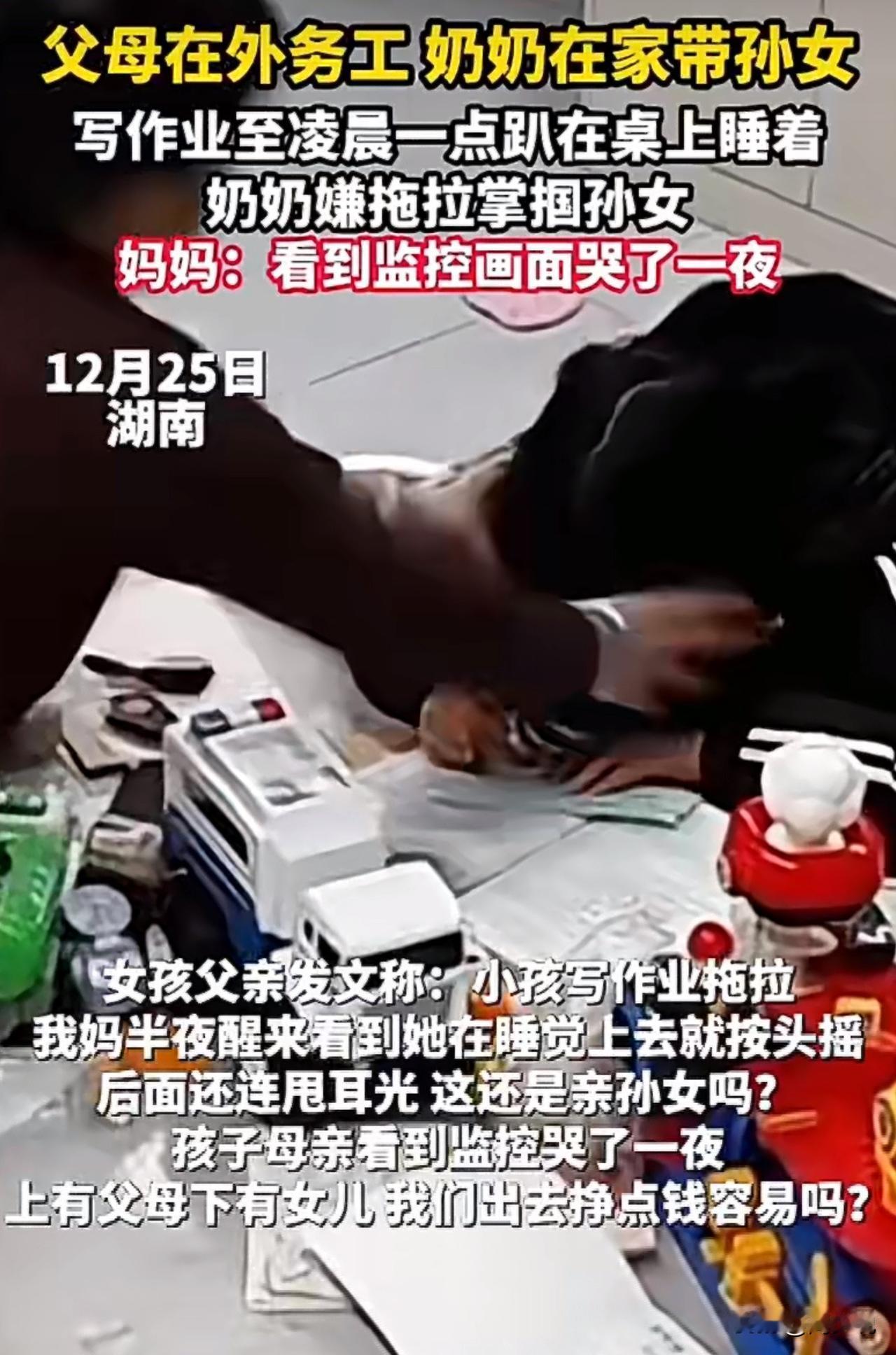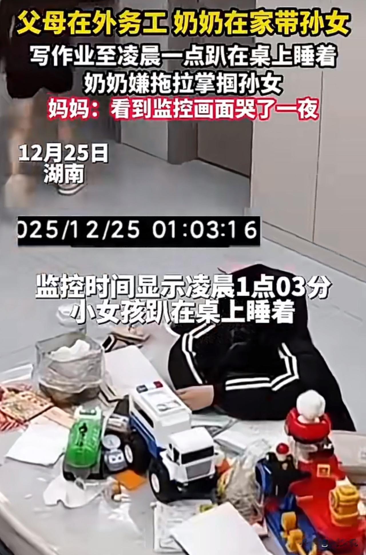 “离谱,这是亲孙女吗?”湖南一女孩写作业到凌晨一点,趴在桌上睡着,被奶奶连续扇巴掌!这一幕被监控拍下,妈妈:“看到监控画面哭了一夜!” 近日,湖南一段家庭监控在网上热传。视频中,女孩父母在外务工,女孩由奶奶照顾。监控显示女孩一个人坐在书桌前写作业,时间一分一秒过去,女孩实在撑不住,趴在桌上睡着了,监控显示凌晨一点过三分。 没过多久,奶奶半夜醒来,走进房间,看到这一幕瞬间火了,直接上前,对着孙女的脸连续扇了好几巴掌。 这一幕正好被监控拍下来,女孩父亲发文称:女儿写作业拖拉,我妈半夜醒来,看到她在睡觉,上去就按头摇后面,还连甩耳光,这还是亲孙女吗? 女孩妈妈更是直言:“看到监控哭了一夜,上有父母下有女儿,我们出去挣点钱容易吗?” 这段视频曝光后,网友炸锅了。有人说:这奶奶太狠了,这么小的孩子熬到凌晨一点,本身就已经很不容易了。 也有人说:父母不在身边,老人只会用自己那一套“棍棒底下出孝子”的老观念管孩子,结果只会越管越逆反。 还有人感叹:“父母在外打工赚钱,以为是为孩子好,却不知道孩子在家里承受着什么。” 看完这事,周少想说父母在外打工,把孩子丢给老人,以为“有人管”就万事大吉。可老人的“管”,往往停留在“盯作业、盯分数”,却很少有人真正关心孩子睡得够不够、开不开心、心里在想什么。 特别是这位奶奶的做法,确实让人气愤又心寒,孩子写作业困到桌子上睡觉,不但没有感到心疼,反而一顿暴揍,换做哪位家长都心疼。 实际上,教育不是靠一巴掌扇出来的,更不是靠熬到凌晨一点“熬”出来的。真正的负责,是看见孩子的疲惫,而不是只看见作业有没有写完;是教会孩子自律,而不是用打骂换来短暂的顺从。#寻美三湘# #长沙新朋友#