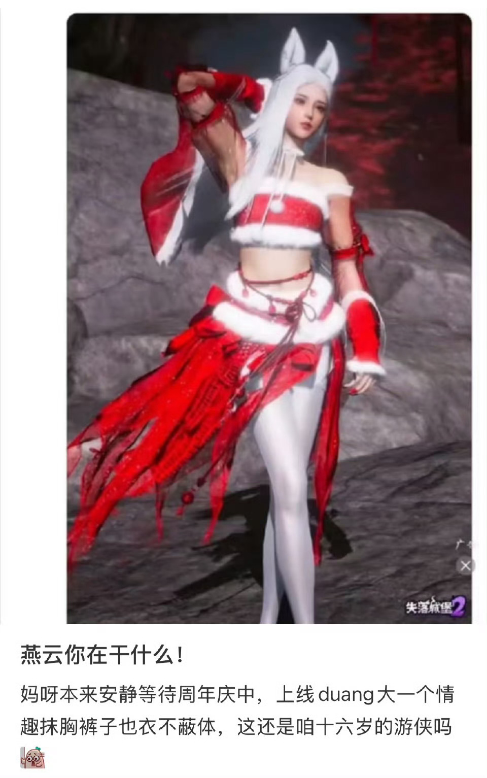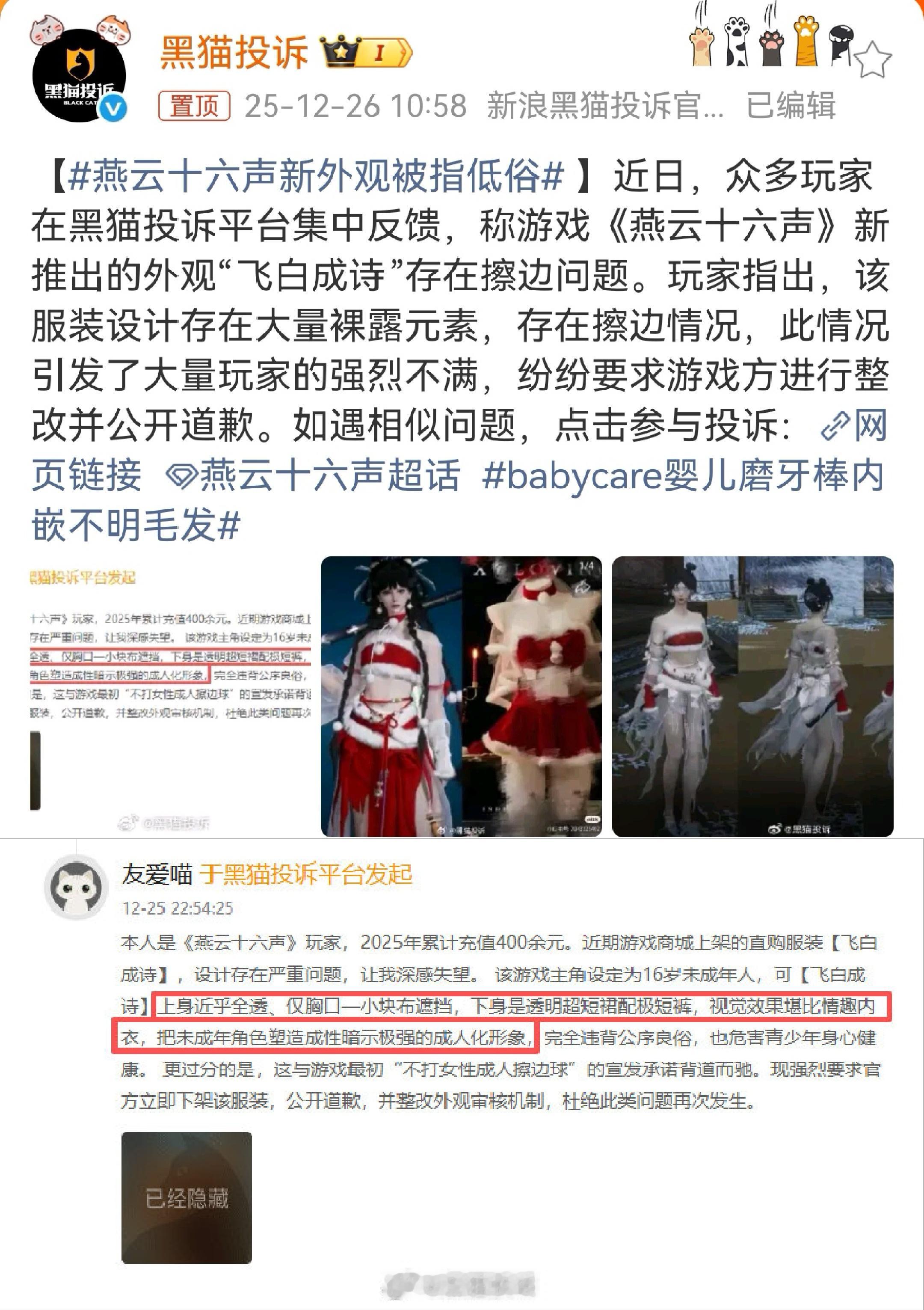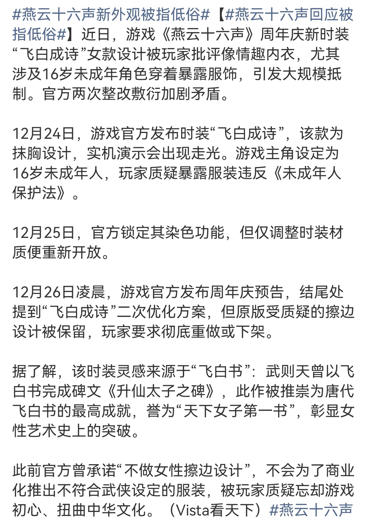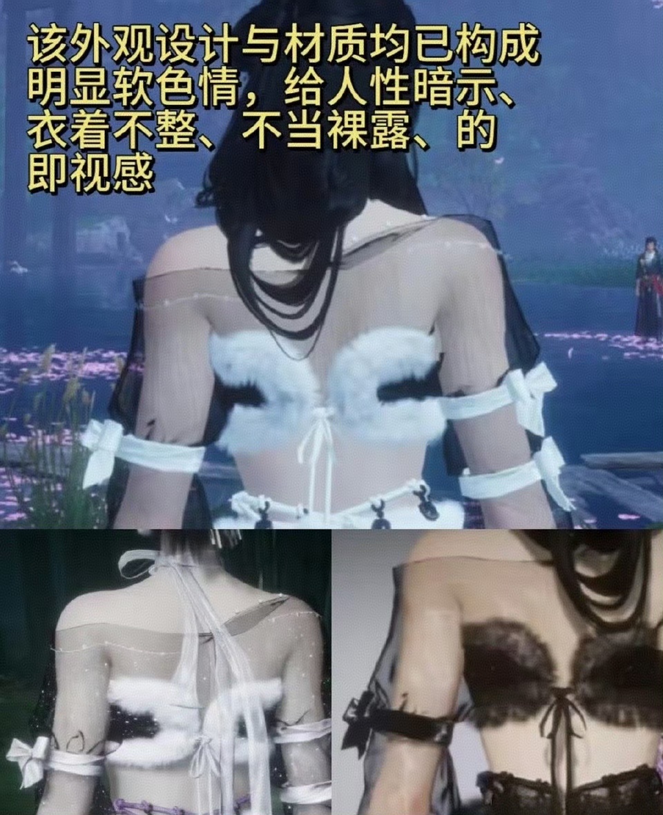 近期,网易游戏《燕云十六声》被指低俗情趣内衣,尤其是周年庆新外观“飞白成诗”中的女款设计,露背绑带、超短裙、透明薄纱等情趣元素,严重背离游戏主打的武侠与国风气质,存在明显的“男凝”倾向,特别是抹胸面积小、位置低,背后只有一根细绳固定,视觉上随时会“滑落”。燕云十六声已调整争议外观服装燕云十六声回应被指低俗随后,网易官方两次“优化”引发次生舆情,越改越错的“治标不治本”,让人不禁质疑,网易游戏策划人员是否素质堪忧?近年来,游戏服装设计为了博眼球,走下三路的擦边路线,且频频因涉嫌色情翻车,明显是故意的。游戏品质才是吸引玩家的关键,至于游戏为盈利而推出的“皮肤”,不能为了迎合某类群体的恶俗喜好,与主流价值观相违背。无论男女角色,服装是否尊重题材设定、是否物化角色、是否传递正确价值观,同样是评判游戏内容好坏的重要标准。燕云十六声回应被指低俗